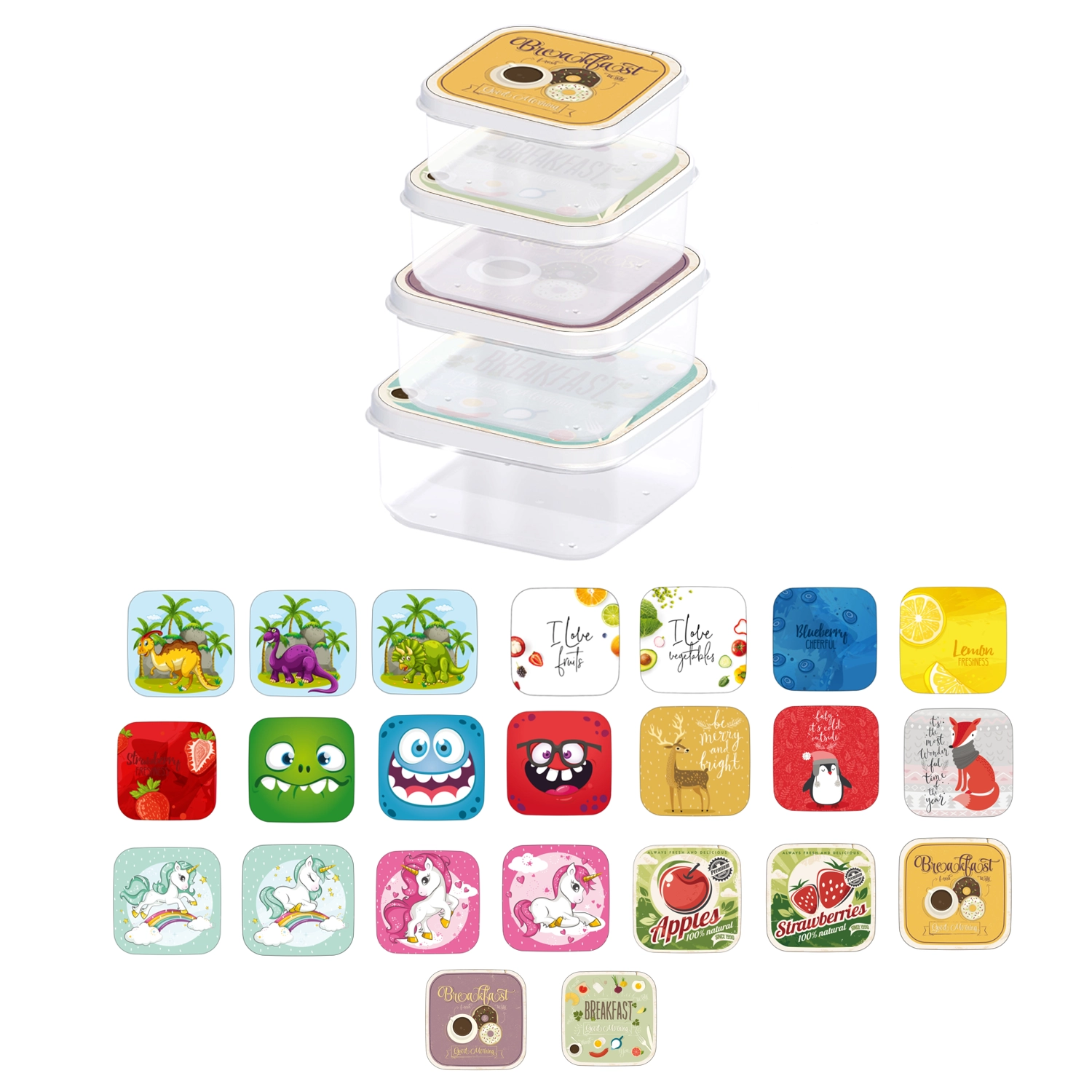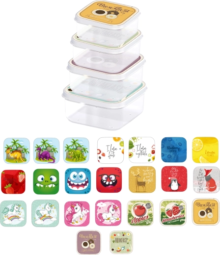 Med dette sæt af 4 firkantede bokse har du altid snacks og mindre fødevarer opbevaret overskueligt og hygiejnisk. Boksene er lavet af holdbar, fødevaresikker plast, og lågene med glade motiver motiverer børn til selvstændig brug.