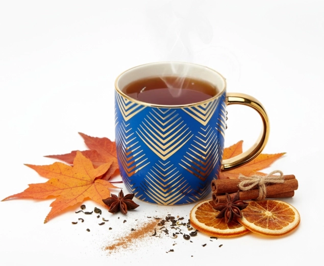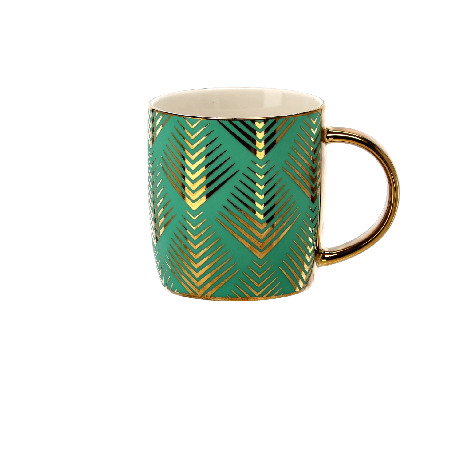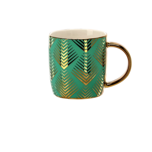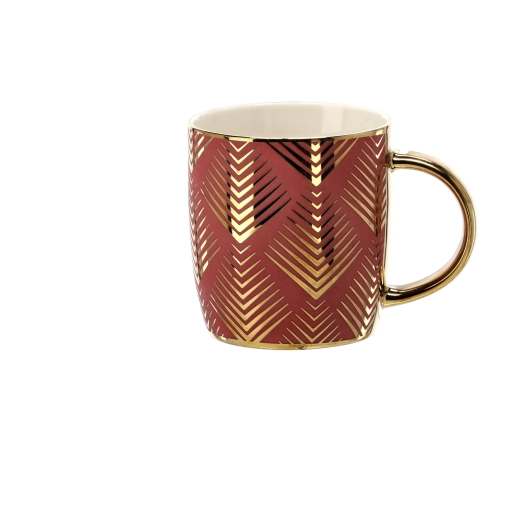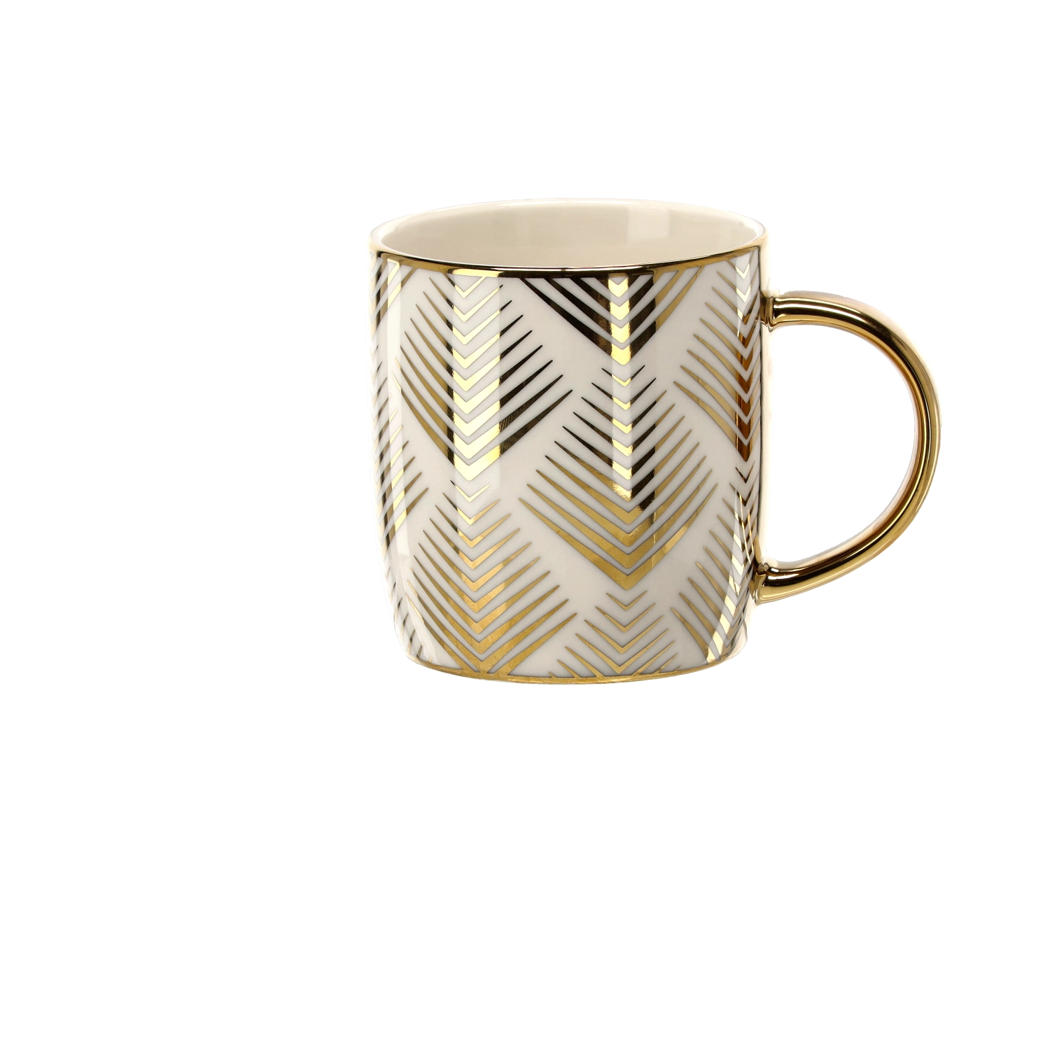 Forkæl dig selv med et porcelænskrus, der forener elegant design og praktisk funktionalitet. Gyldne accenter med geometrisk chevronmønster giver et premiumlook, mens det behagelige håndtag gør hverdagsbrug let.