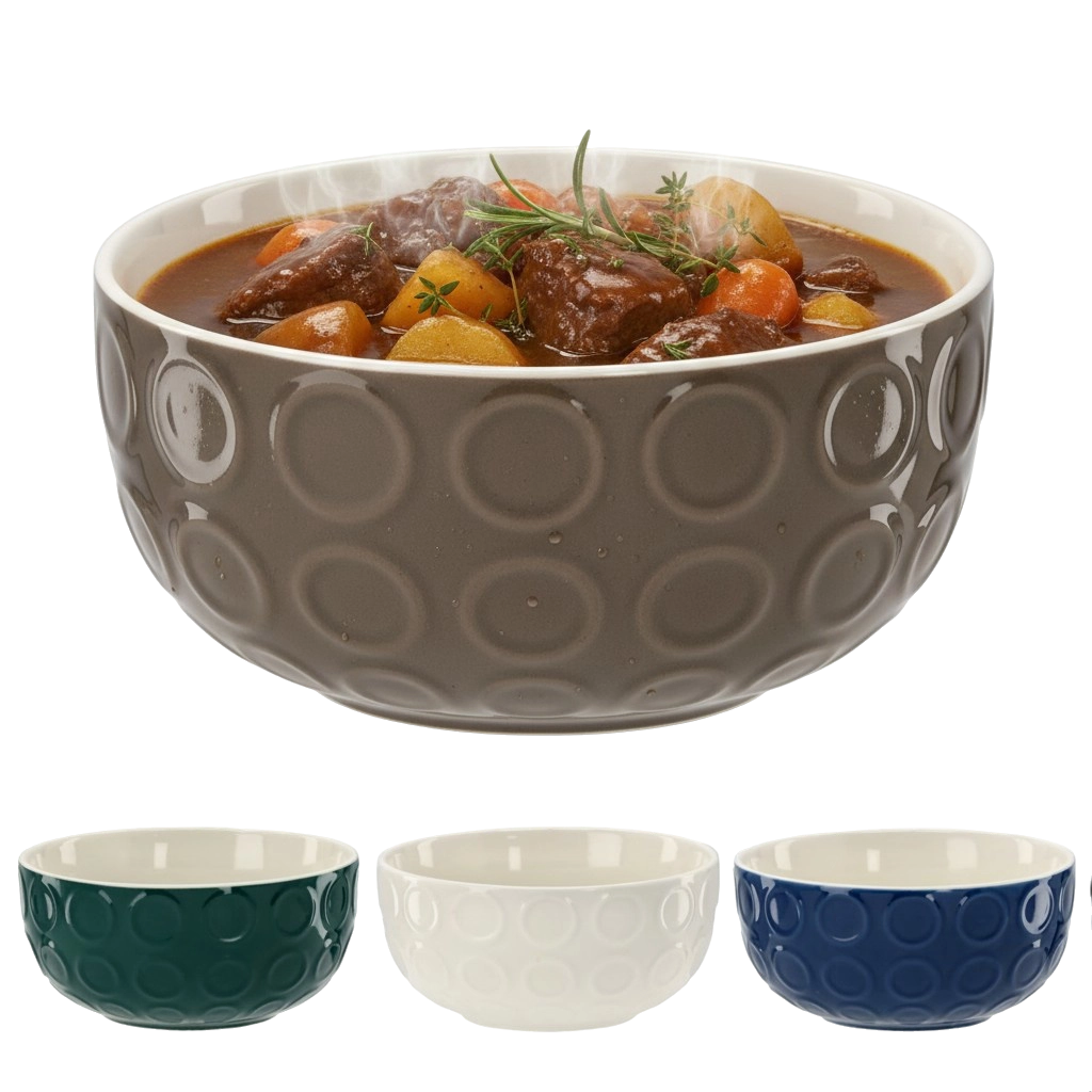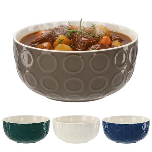 Stilfuld porcelænsskål med et volumen på 550 ml og præget cirkulært mønster – ideel til supper, morgenmadsprodukter og salater. Robust keramik, nem vedligeholdelse og tidløst design passer perfekt i ethvert køkken. Tåler opvaskemaskine og egner sig glimrende til daglig servering.