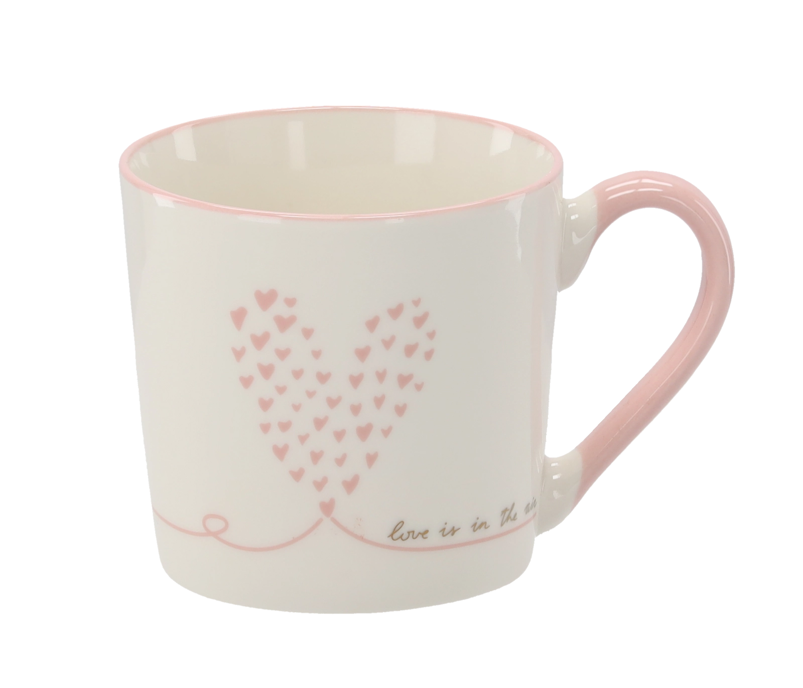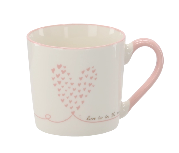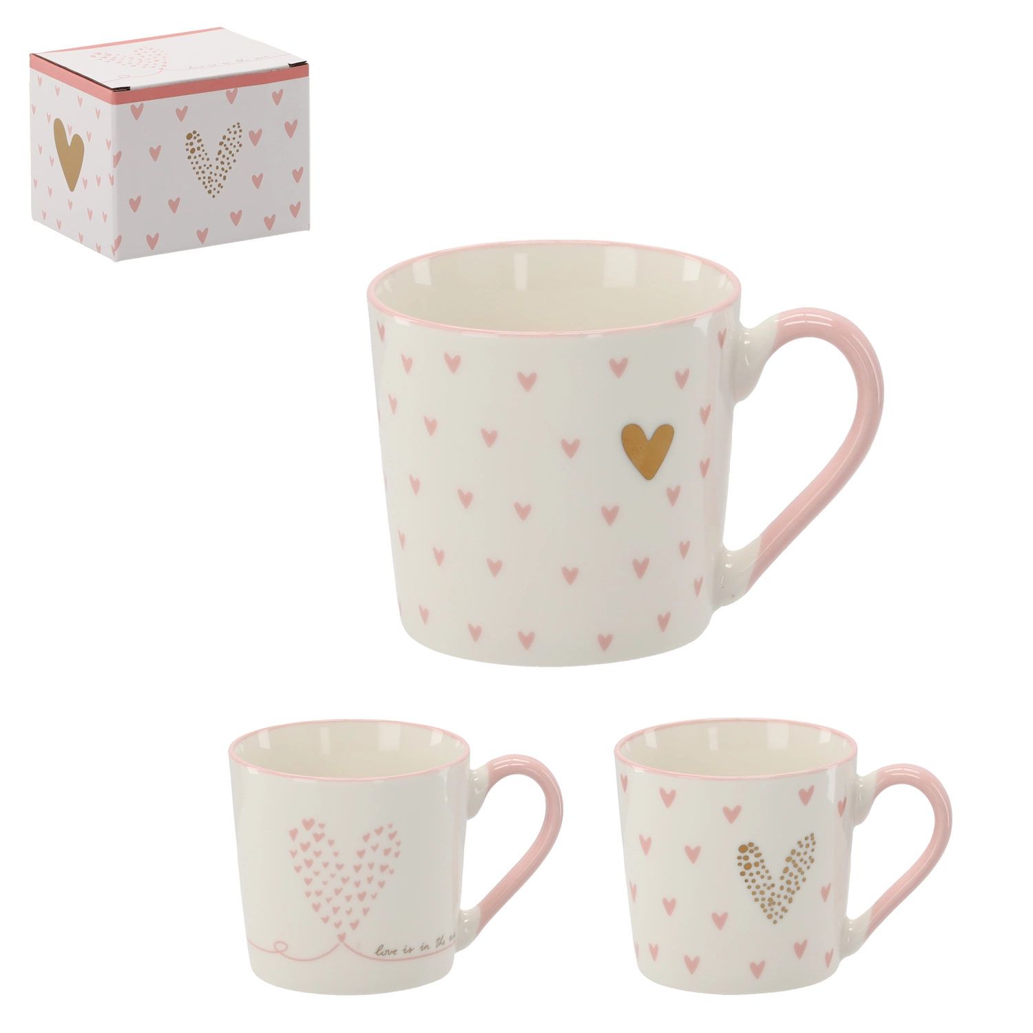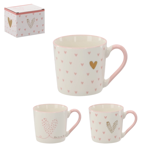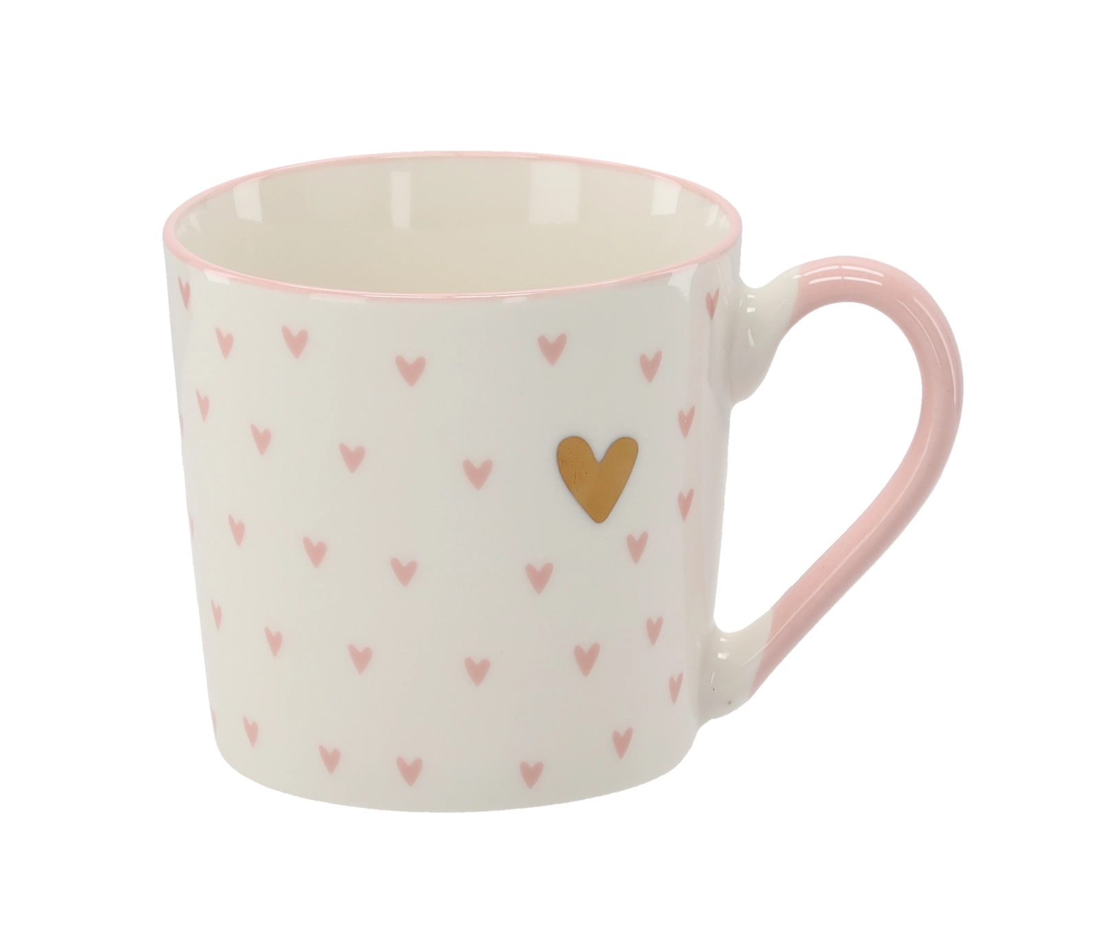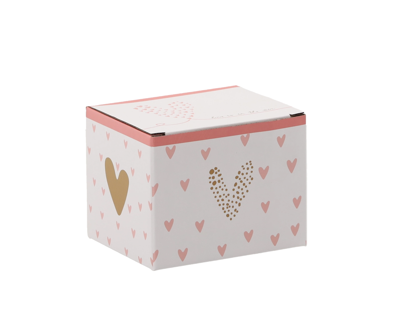 En stilfuld æske med rosa og gyldne hjerter gør kruset til en ideel gave til enhver lejlighed.