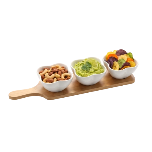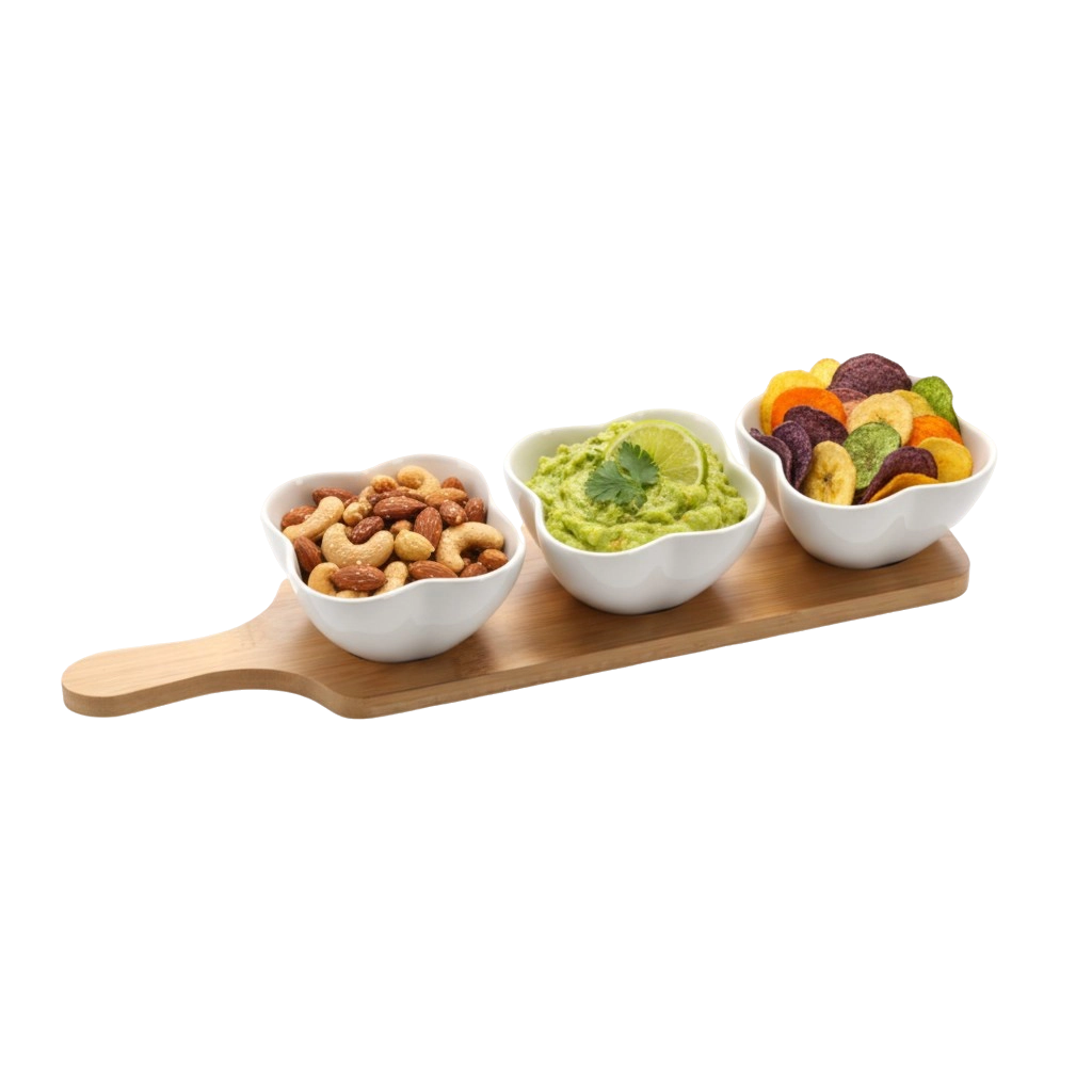 Elegant sæt med tre porcelænsskåle formet som en firkløver på en aflang bambusbakke, ideel til servering af forretter, dips og snacks. Skålene i kvalitets hvid keramik er holdbare, nemme at vedligeholde og kan bruges i opvaskemaskine og mikrobølgeovn. Bambusbakken er let at vedligeholde, fugtbestandig og sikrer stabilitet under transport.