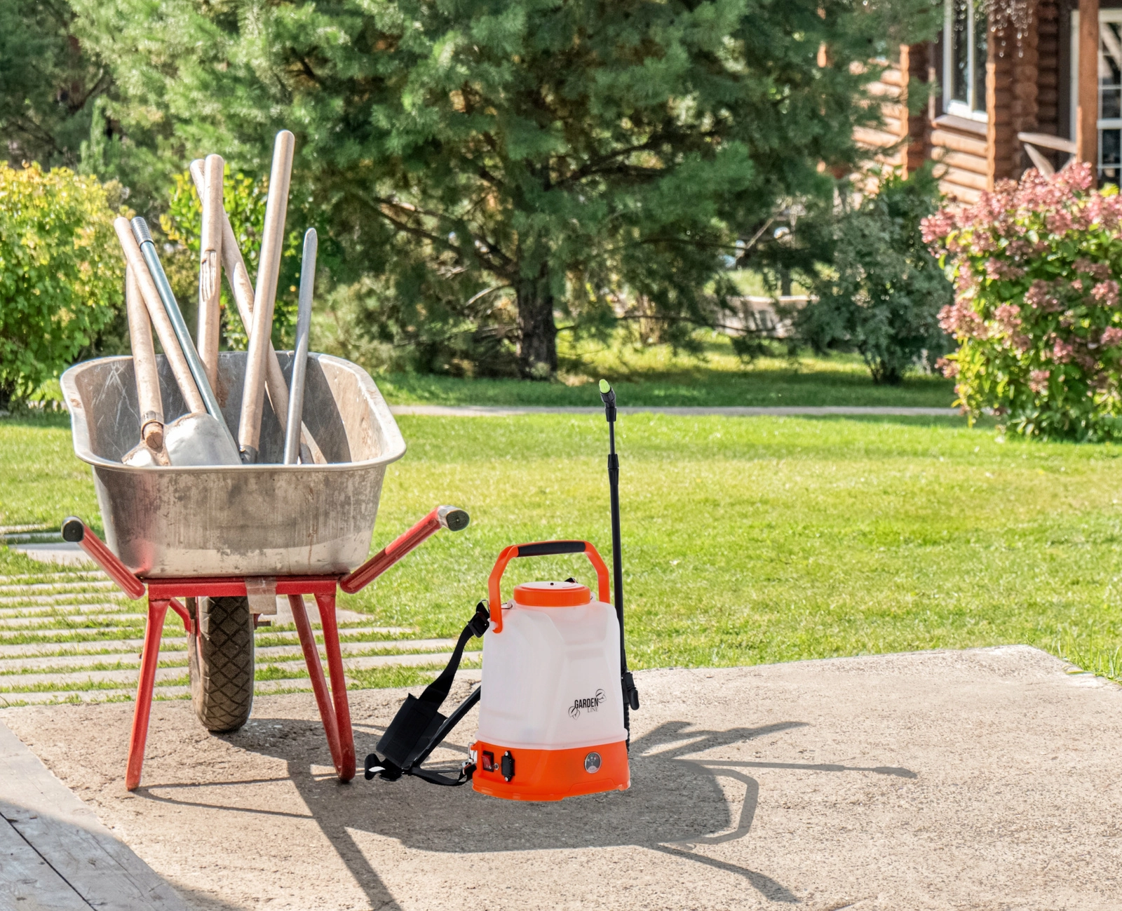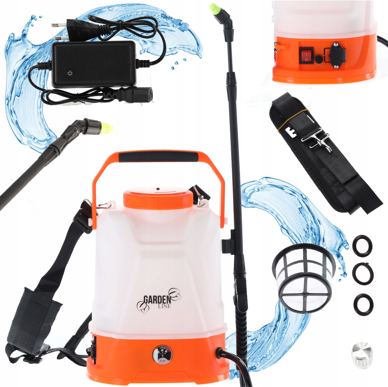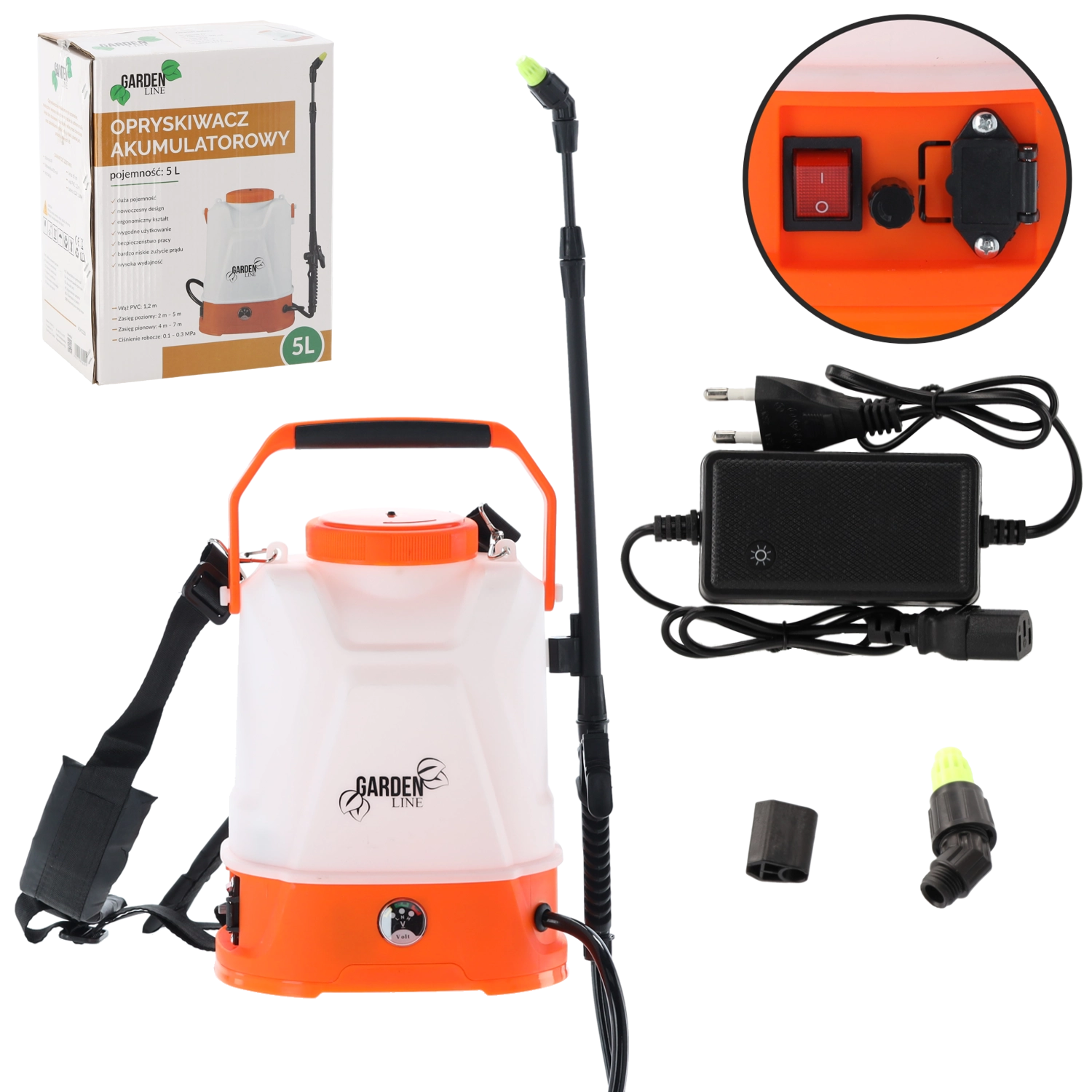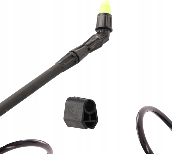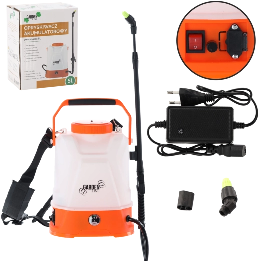 Udstyret omfatter en justerbar dyse til fin tåge eller samlet stråle, 65 cm lanse med adapter, 120 cm slange for fri bevægelse, filter og pakningssæt. Den dækkede ladeport beskytter elektronikken og forlænger enhedens levetid. Sprøjterækkevidden er op til 5 m vandret og op til 7 m lodret.