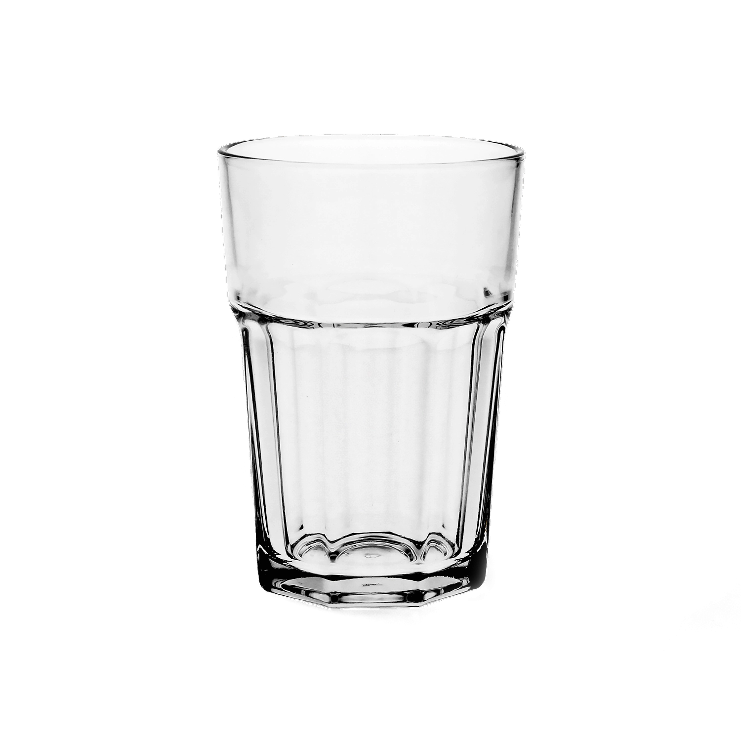 Opdag de alsidige Aras-glas på 365 ml, som udmærker sig ved et rent formsprog og en solid konstruktion. De flerfasede vægge forbedrer grebet og fremhæver visuelt de serverede drikke – fra forfriskende lemonader og juice til cocktails og longdrinks.