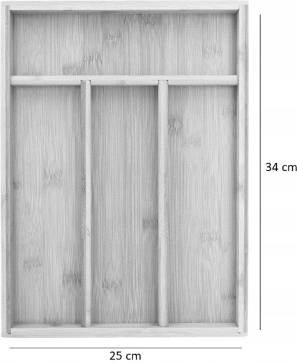 Hold orden i køkkenet med en praktisk bambusorganisator til bestik med fire rum. Dens kompakte mål 34 × 25 × 4,5 cm passer i de fleste skuffer og sikrer, at dine gafler, knive og skeer altid er lige ved hånden. Robust bambus, naturligt udseende og overskuelig inddeling gør den til et ideelt valg til daglig brug.