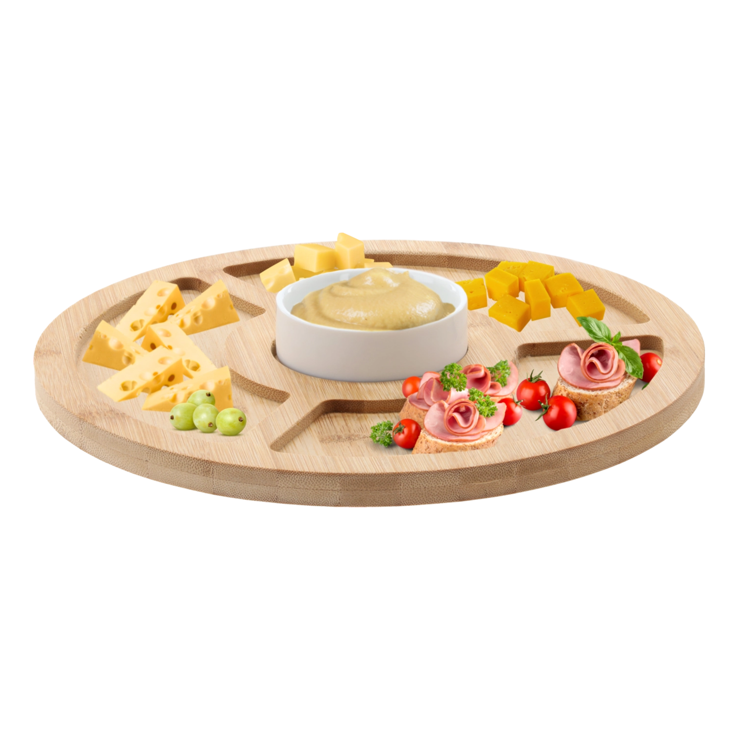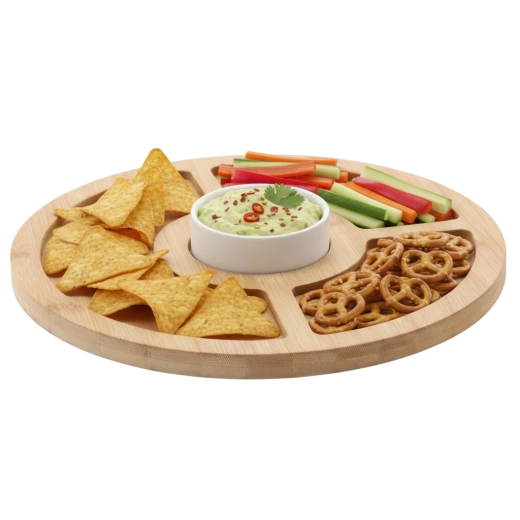 Dette runde bambus serveringsfad med porcelænsskål er en fremragende løsning til hjemmehygge og sociale sammenkomster. Med de fire separate sektioner holder du hver type snack på sin plads, mens den centrale skål i porcelæn er perfekt til dips og saucer.
