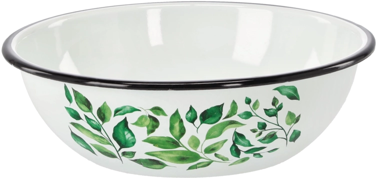 Praktisk og elegant emaljeskål med en kapacitet på 2,5 l og en diameter på 24,5 cm i hvid farve med ficus-motiv. Ideel til daglig brug – fra dejblanding til servering af salater. Den holdbare emaljeoverflade er hygiejnisk, nem at rengøre og påvirker ikke smag eller duft af maden. Takket være modstandsdygtighed over for både høje og lave temperaturer byder den på bred anvendelse i ethvert køkken.