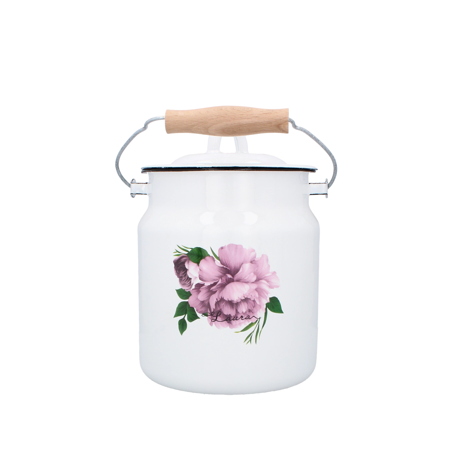 Kanden er ideel til transport, opbevaring og opvarmning af mælk, men fungerer lige så godt til andre væsker. Emaljeret stål er korrosionsbestandigt og hygiejnisk, hvilket gør det til et fremragende valg til daglig brug. Det elegante hvide design med blomstermotiv af pæon er let at kombinere med andet køkkentilbehør og virker dekorativt på køkkenbordet.