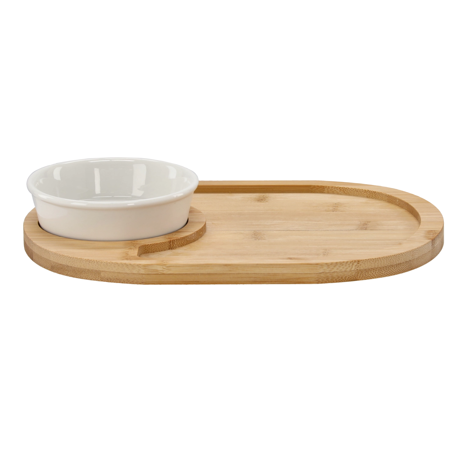 Dette alsidige sæt til servering af forretter imponerer med et moderne, naturligt look og en funktionel udformning. Det ovale bambusfad med dedikeret plads til porcelænsskålen gør det nemt at arrangere oste, charcuteri, oliven eller brød og samtidig servere saucer, dips eller pesto. Takket være målene 28 × 21 × 4 cm tilbyder det rigelig plads til varierede anretninger.