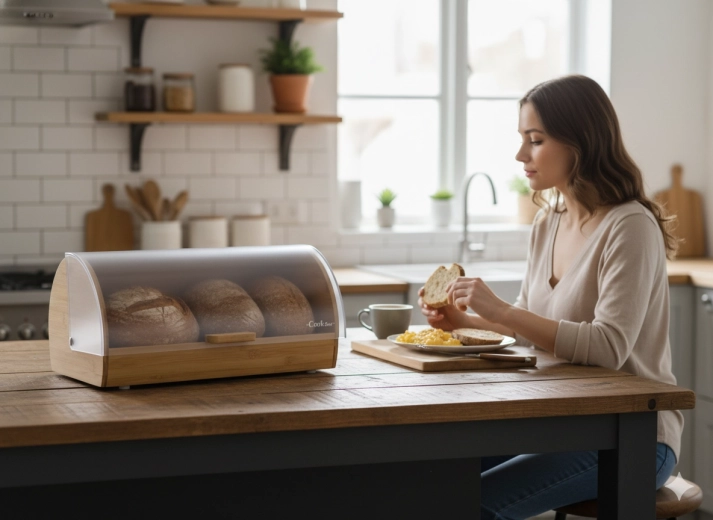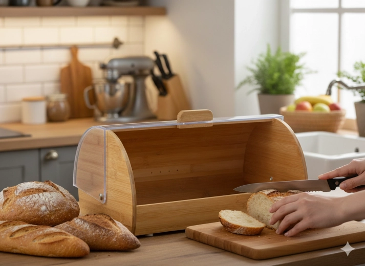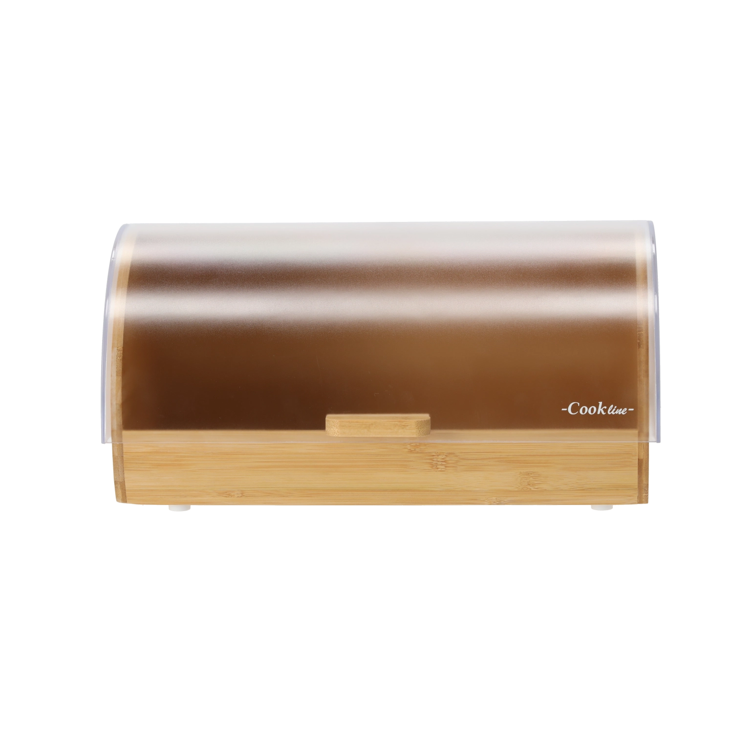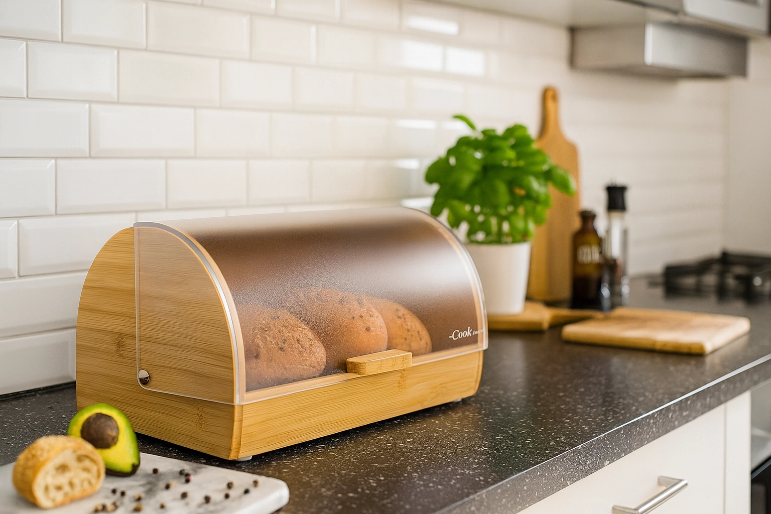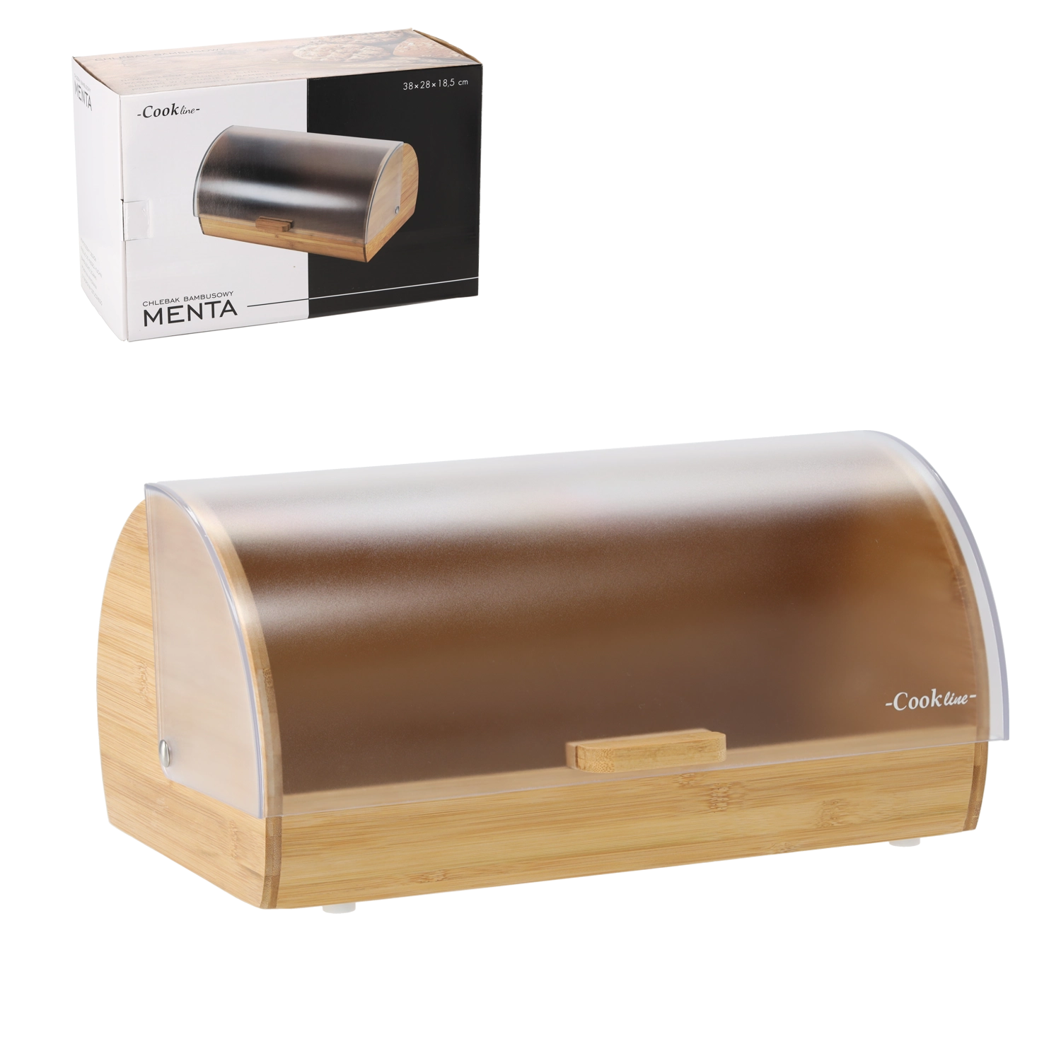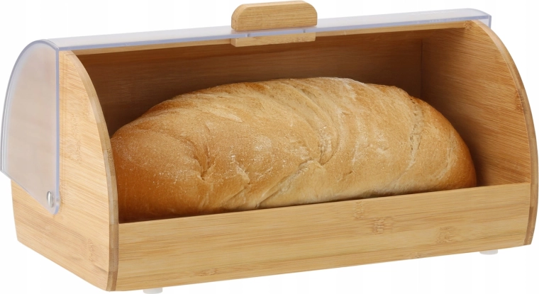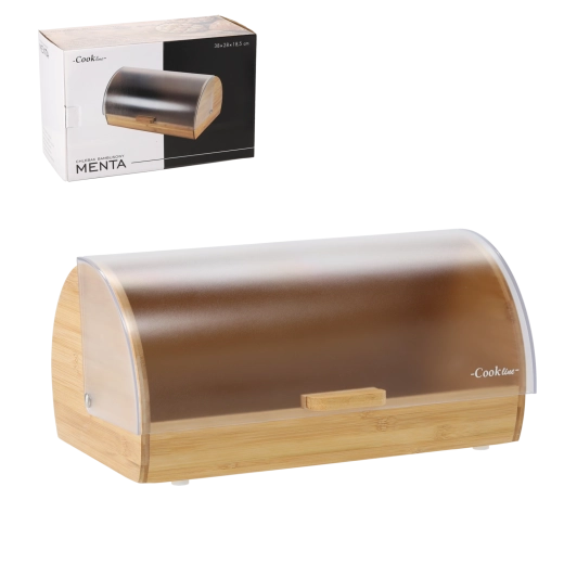 Elegant brødkasse MENTA i kvalitetsbambus med halvgennemsigtigt rullelåg, som holder bagværk friskt længere og beskytter mod støv og udtørring. Den generøse kapacitet rummer både brød, rundstykker og bagværk, mens det ergonomiske håndtag sikrer nem åbning. Det tidløse moderne design passer perfekt i ethvert køkken.