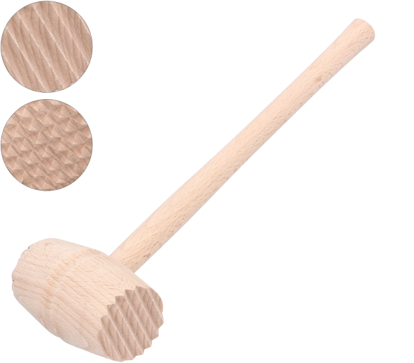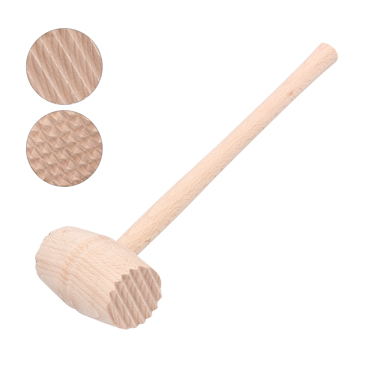 Praktisk trækødhammer af kvalitetsbøgetræ med to rustfri stålhoveder med en diameter på 4,5 cm til effektiv bankning. Den ergonomiske håndtag på 23 cm sikrer et behageligt og sikkert greb, mens den lakerede overflade beskytter træet mod fugt og gør vedligeholdelsen lettere. Samlet længde 28 cm giver ideel kraftoverførsel til arbejde med forskellige typer kød.