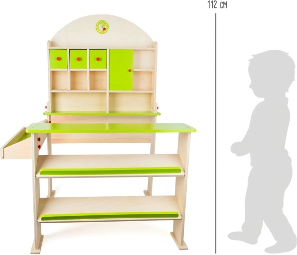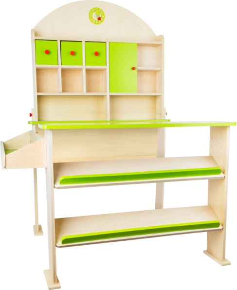 En moderne træbaseret salgsbod udvikler ikke kun børns kommunikations- og regnefærdigheder, men understøtter også deres kreativitet. Den er udstyret med opbevaringsrum, der inkluderer skrå hylder til kasser og separate hylder til modeller og varer. Bagvæggen indeholder hvileområder og skabe med funktionelle døre. På toppen af standen er der ure, som børn kan bruge til at lære tid og indstille åbningstider.