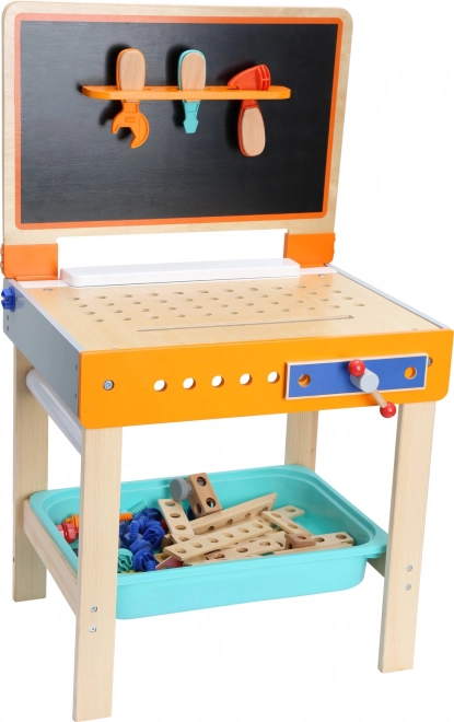 Oplev det smarte børnebord, der med et enkelt greb forvandles fra tegnebord til arbejdsbænk. Det foldbare tegnepanel med værktøjshylde, arbejdspladen med huller til fastgørelse af dele og holderen til papirrollen på siden gør dette bord til det perfekte sted til både kreativt skaberi og byggeri.
