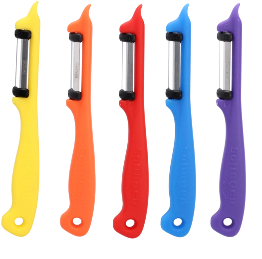 Opdag en pålidelig skræller, der fremskynder madlavningen og gør den daglige madlavning mere behagelig. Takket være bevægelige dobbeltsidede klinger i rustfrit stål fra SOLINGEN klarer den både tynde og tykkere skræller og efterlader overfladen glat uden unødvendigt spild af råvarer. Det ergonomiske håndtag af polypropylen giver et sikkert og komfortabelt greb – også ved længerevarende brug.