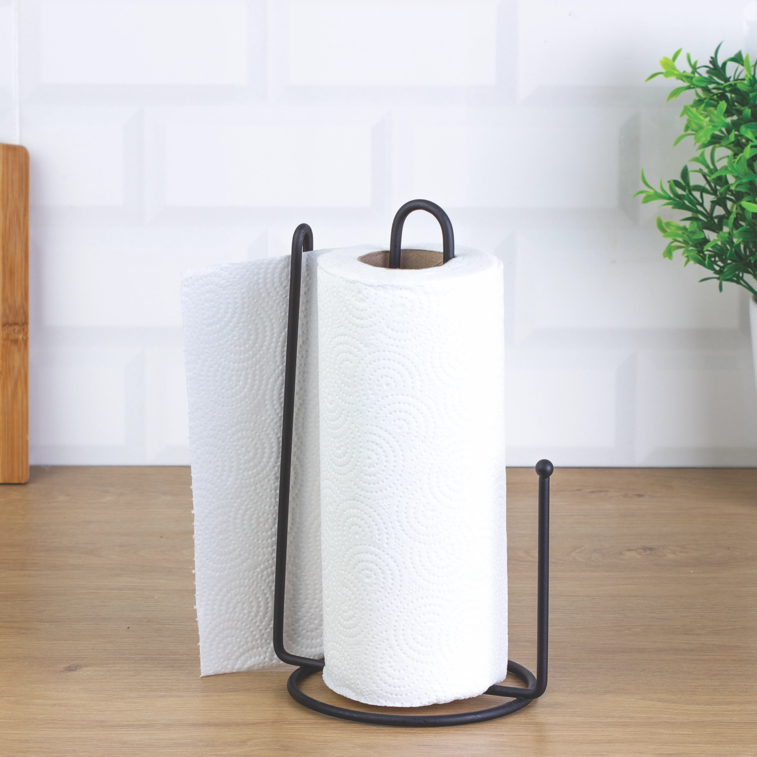 Bring funktionelt design ind i køkkenet med en metalholder til papirhåndklæder i mat sort. Den robuste metalkonstruktion sikrer lang levetid og styrke, mens bambuselementet tilføjer et naturligt præg og bløder det industrielle udtryk op. Takket være den smarte udformning kan ark nemt rives af med én hånd, hvilket er praktisk både under madlavning og rengøring.