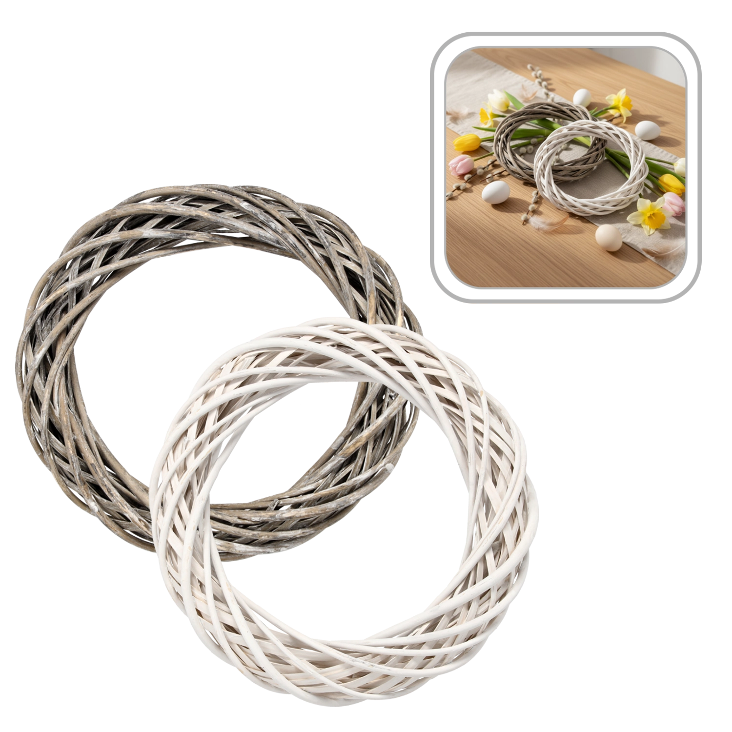 Denne kvalitetsfremstillede flettede krans er en alsidig dekorationsbase, som du nemt kan tilpasse til enhver årstid. Skab originale jule-, påske- eller efterårsarrangementer – suppleret med bånd, blomster, kviste, tørrede materialer, lyskæder eller små pyntegenstande vil den altid se stilfuld ud.