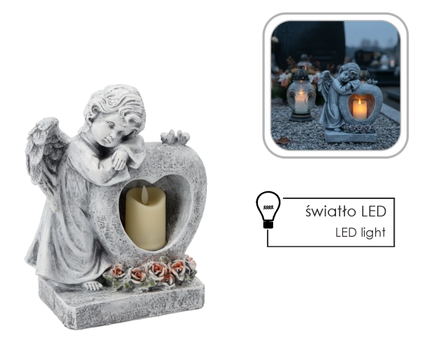Elegant figur af en engel, der læner sig mod et hjerte med indbygget LED-lys, skaber en varm og rolig atmosfære i hjemmet. Den blide grå farve og detaljeret udførelse med små duer, der symboliserer fred og kærlighed, gør den til en virkningsfuld dekoration på kommode, hylde eller i et mindehjørne. Energibesparende LED-belysning på batterier sikrer sikker og langvarig glød uden flamme.