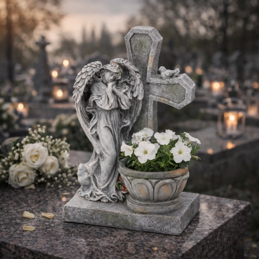 Figuren er ideel til placering på gravsted, mindesmærke eller i et havehjørne. Blomsterkrukken giver mulighed for at indsætte friske eller kunstige blomster og understreger dermed den personlige erindring og troens symbol.