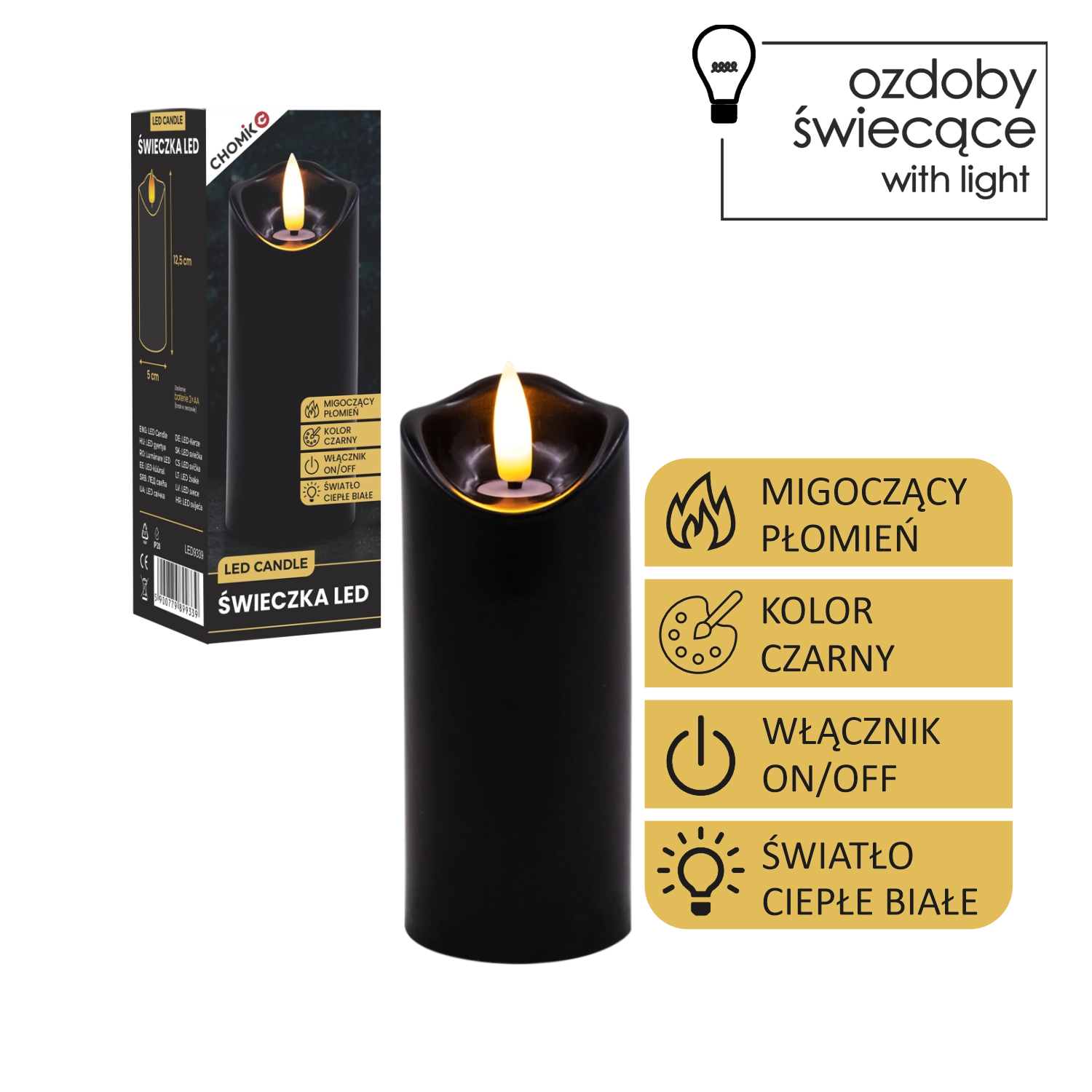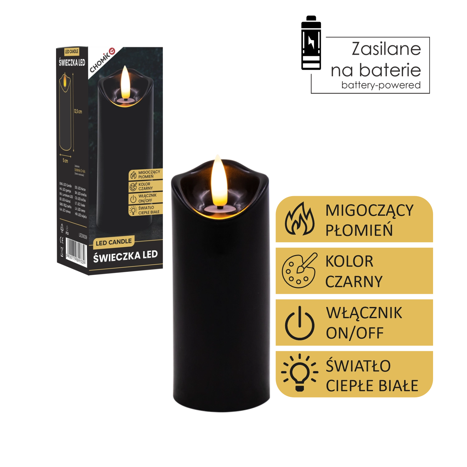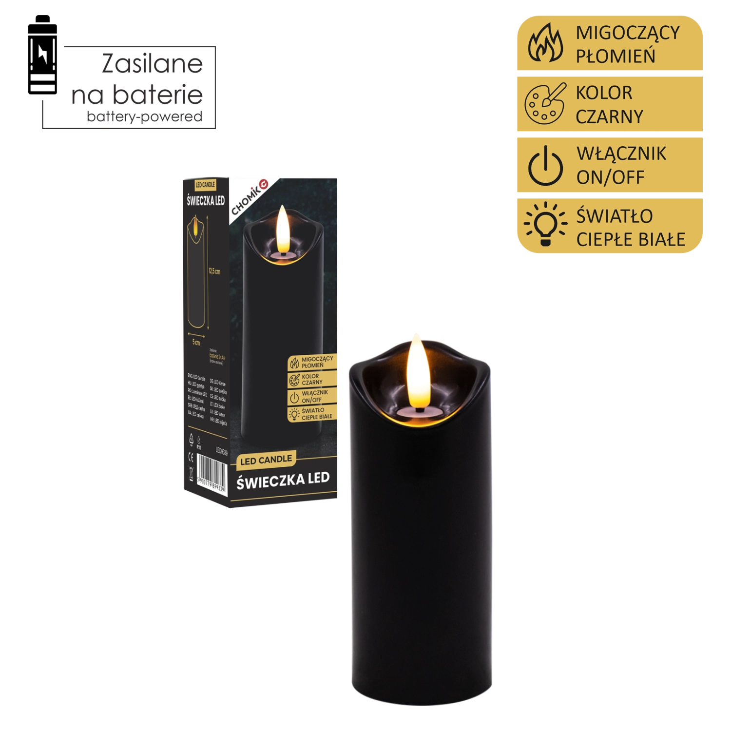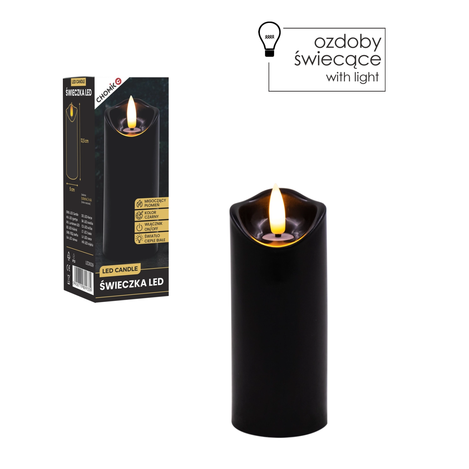Skab behageligt lys når som helst og hvor som helst. Dette sorte LED-lys i størrelsen 5 × 12,5 cm lyser i varm hvid og takket være den realistiske flammeflimren efterligner det en ægte stearinlysflamme – uden rod, lugt og risikoen ved åben ild.