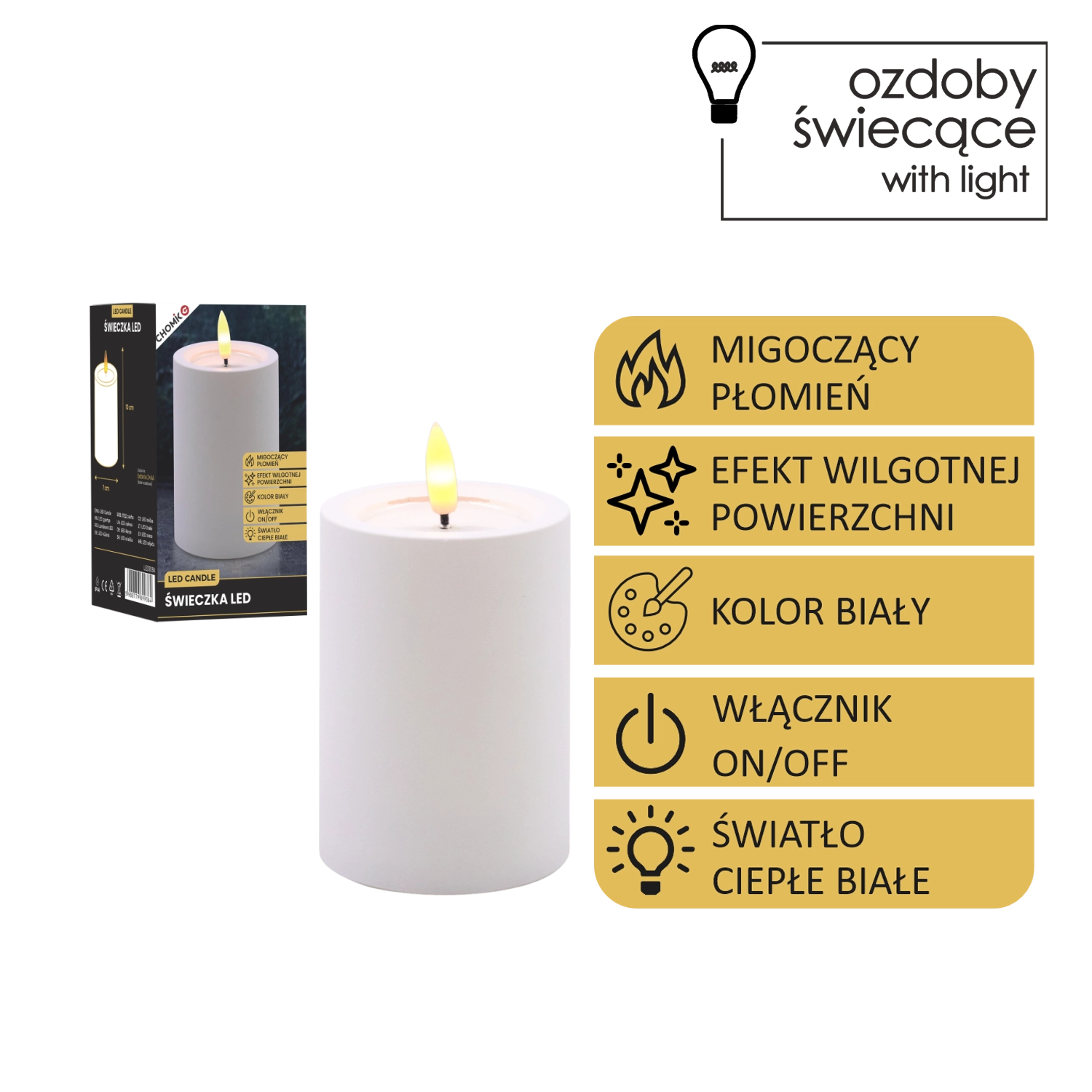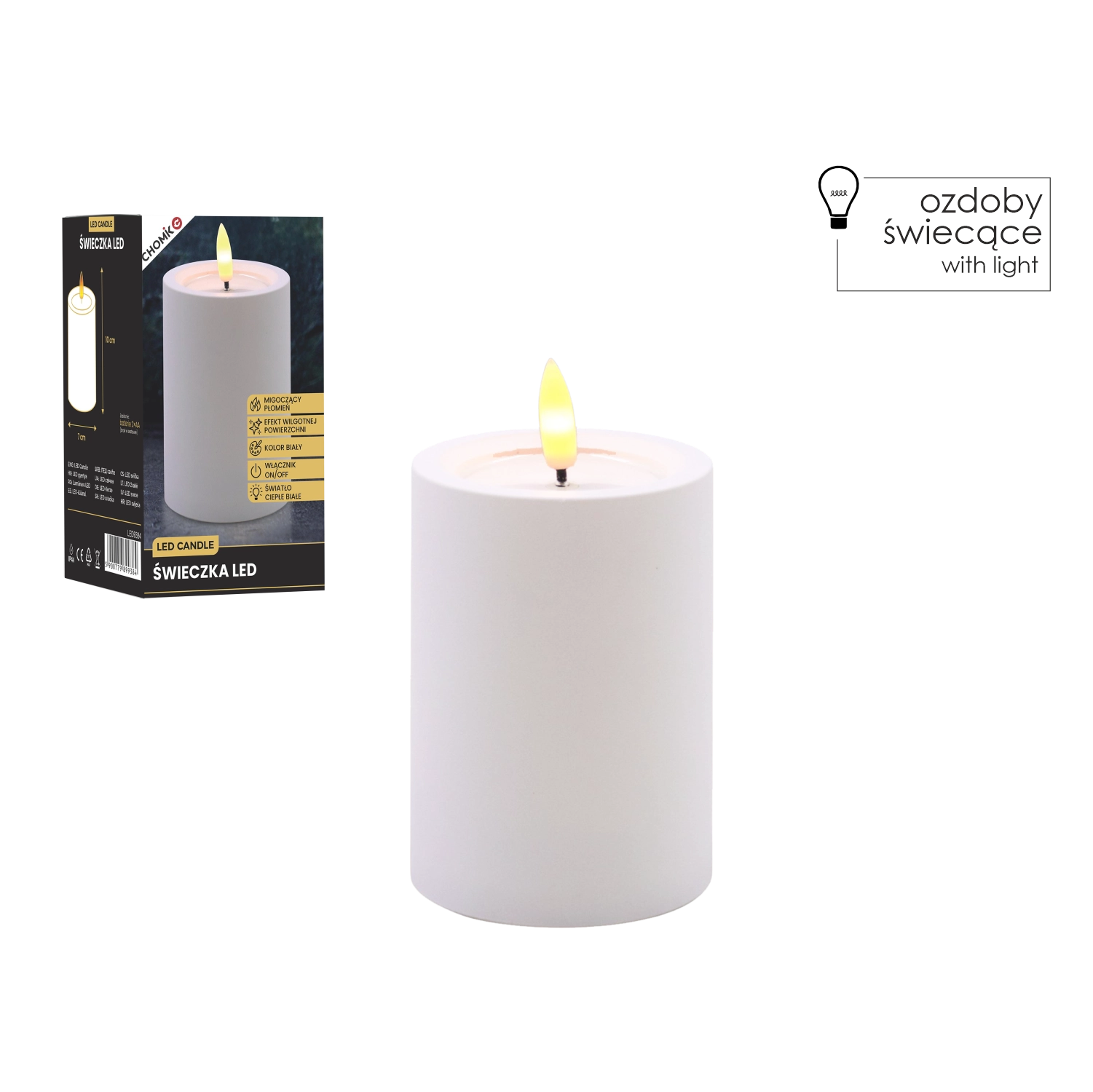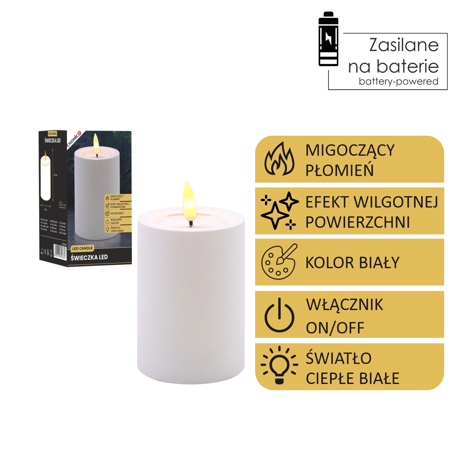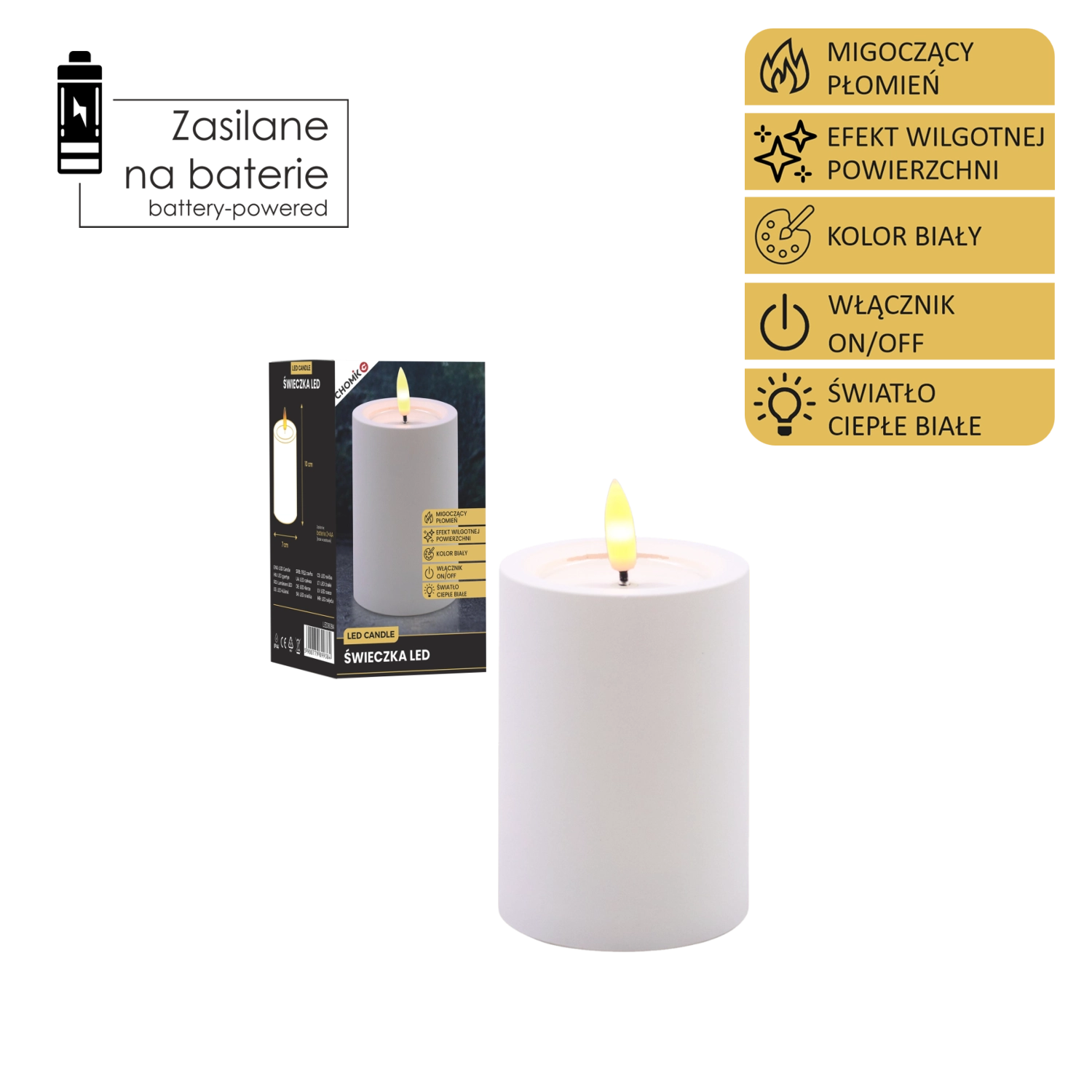 Dekorativt LED-stearinlys i hvid med målene 7 × 10 cm, som giver et sikkert og stemningsfuldt lys med en flakkende flamme i varm hvid. Har en realistisk effekt af en fugtig øverste kant, og passer perfekt i stue, soveværelse og på festligt dækket bord. Uden åben flamme og røg, nemt at betjene med On/Off-kontakt, drevet af 2× AA-batterier (medfølger ikke).