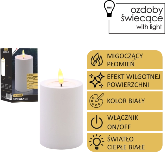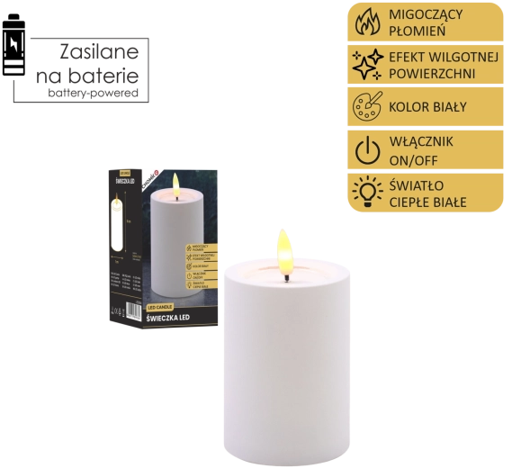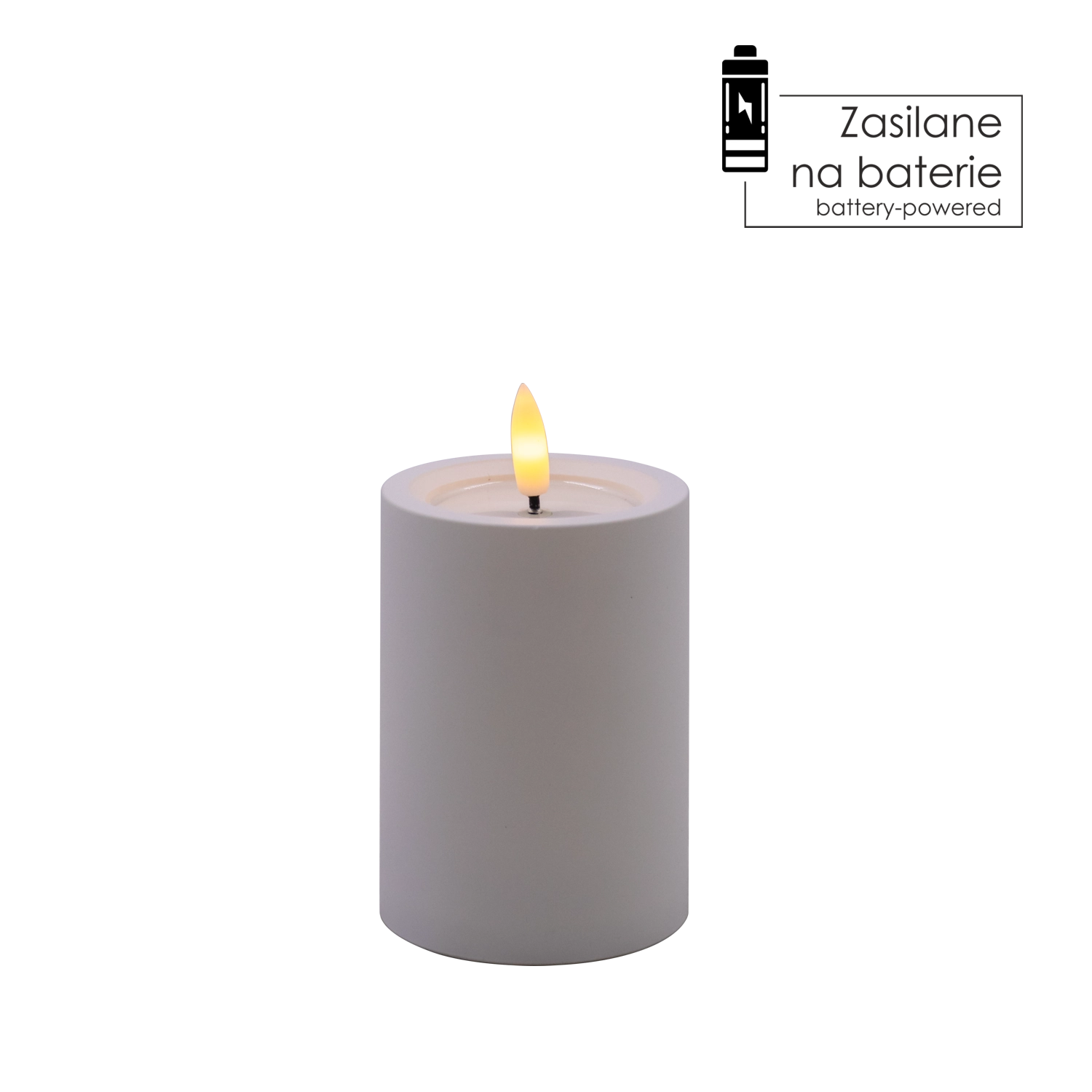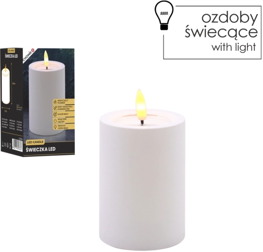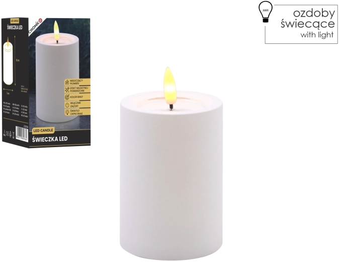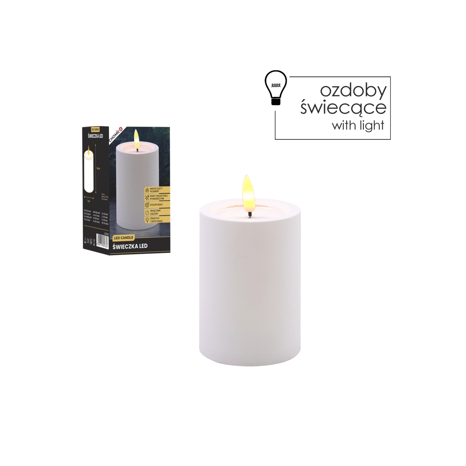 Dekorativt LED-stearinlys i hvid med målene 7 × 10 cm, som giver et sikkert og stemningsfuldt lys med en flakkende flamme i varm hvid. Har en realistisk effekt af en fugtig øverste kant, og passer perfekt i stue, soveværelse og på festligt dækket bord. Uden åben flamme og røg, nemt at betjene med On/Off-kontakt, drevet af 2× AA-batterier (medfølger ikke).