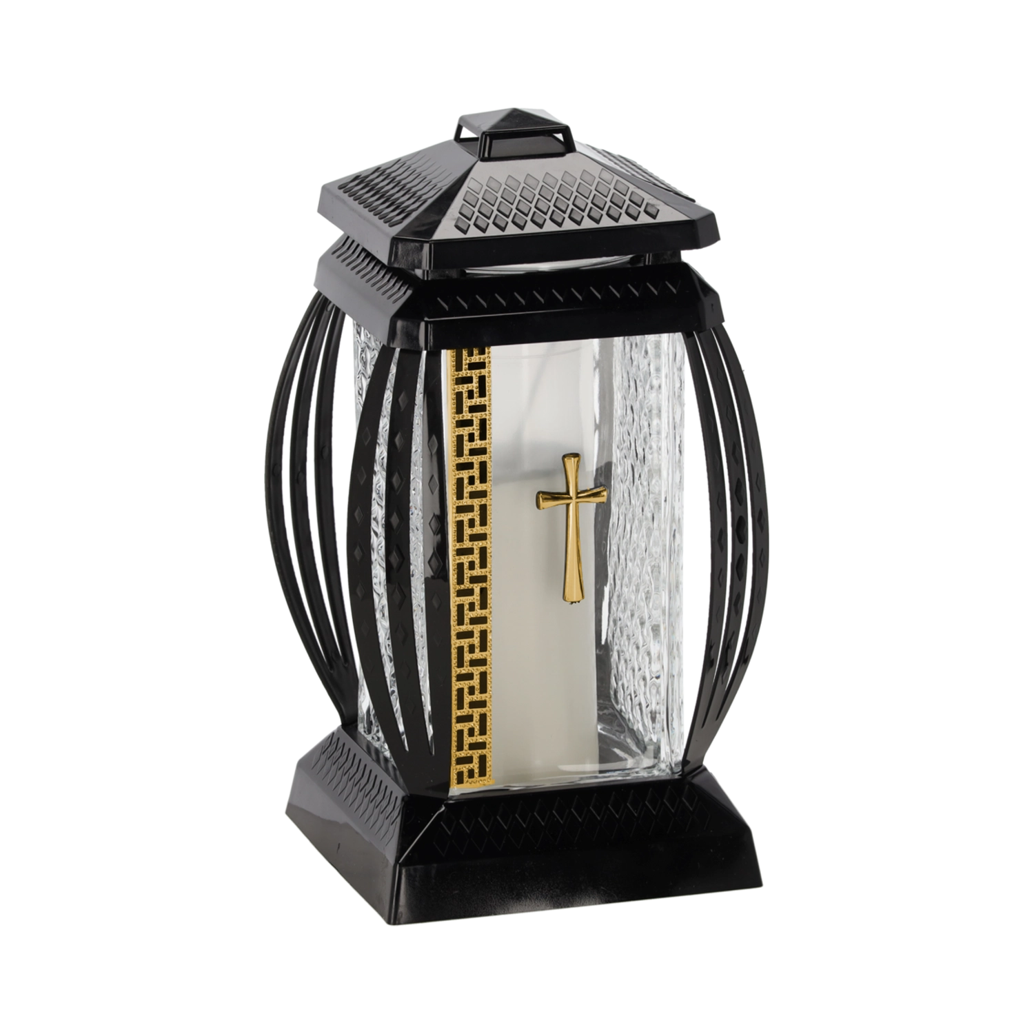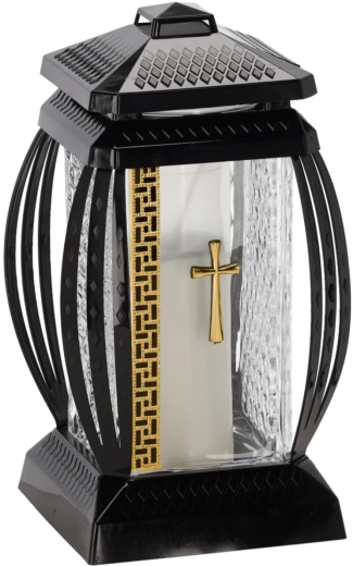 Elegant gravlys, model Prima Vera, med en højde på 28 cm, dekoreret med glimmer og korsmotiv i guld eller sølv. Giver op til 45 timers brændetid, kombinerer æstetisk elegance med lang holdbarhed og er ideel til en værdig udsmykning af gravstedet.