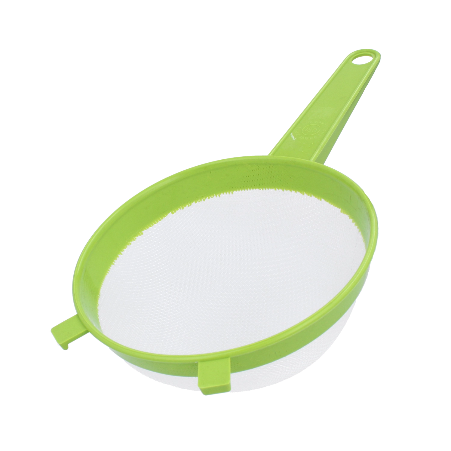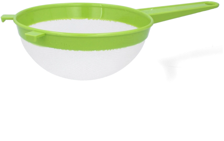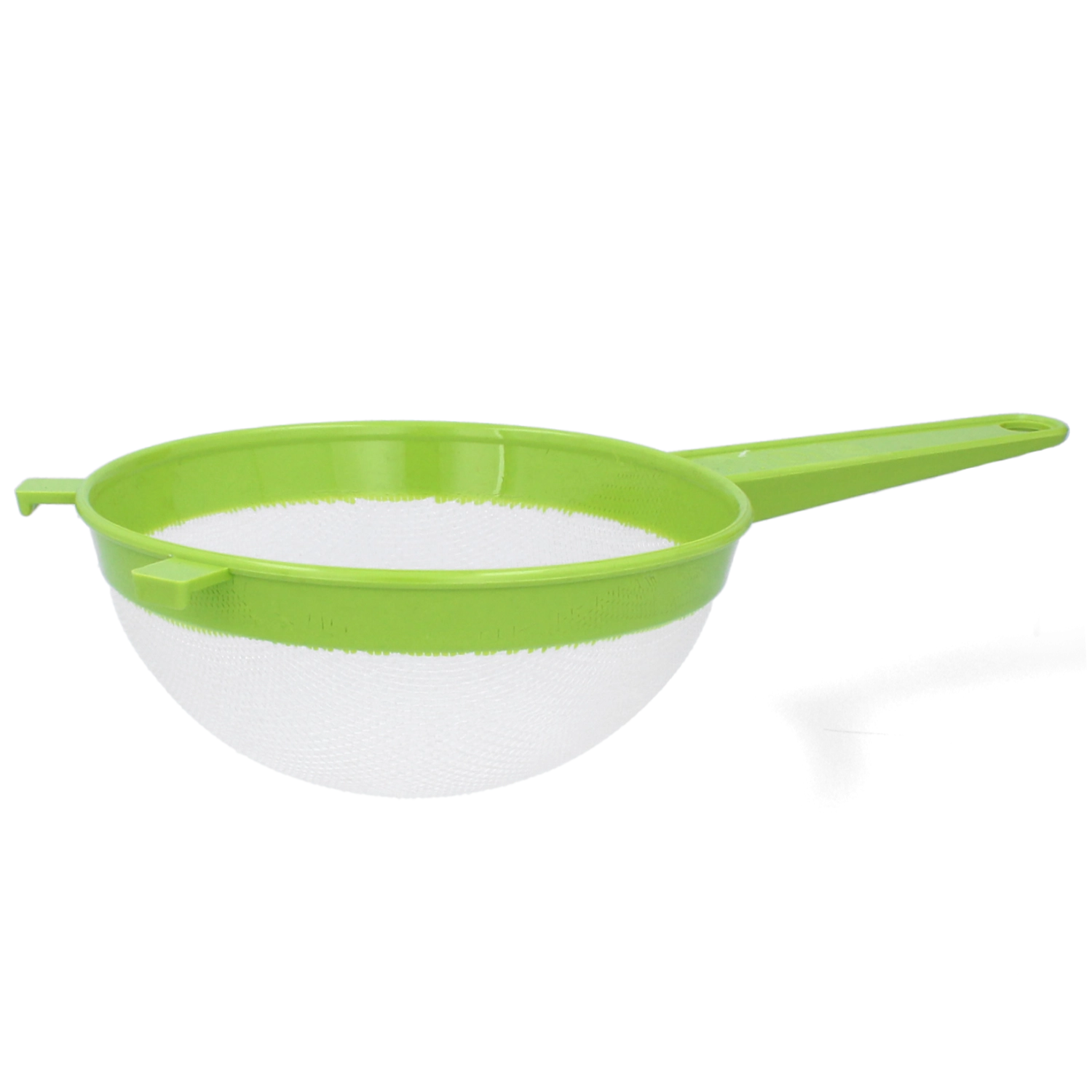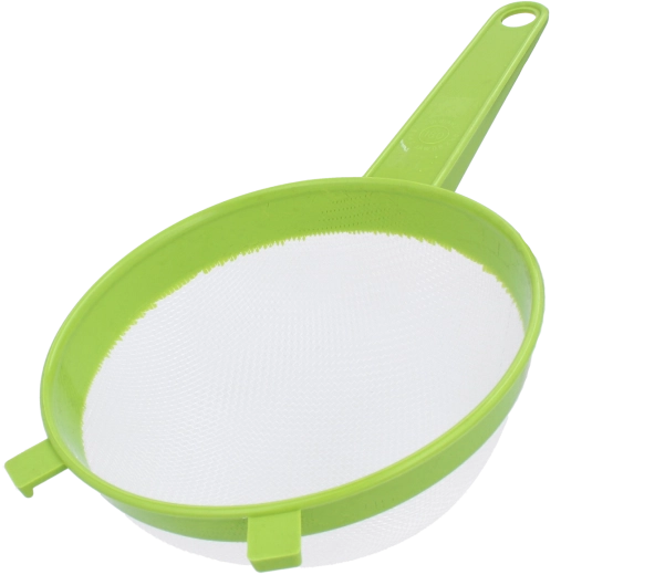 Praktisk køkkensi med kugleformet skål med en diameter på 18 cm, som gør den daglige madlavning lettere. Velegnet til skyldning af frugt og grøntsager, sigten af mel og sukker samt sining af væsker. Takket være den ergonomiske håndtag og de stabile kroge kan den nemt hvile på en gryde eller skål. Den lette og holdbare plastkonstruktion er nem at vedligeholde, og det fine net med masker på ca. 1,3 mm sikrer effektiv adskillelse af faste partikler.