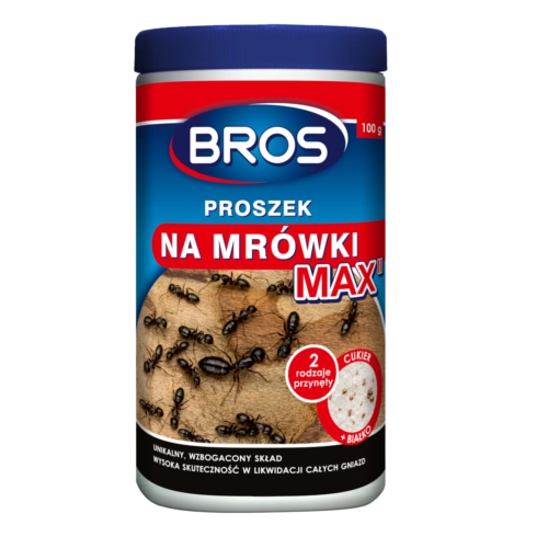 Det effektive insekticidpulver BROS MAX bekæmper pålideligt myrer indendørs og omkring huset. Takket være kombinationen af sukker- og proteinagn er det yderst attraktivt for myrer, hvilket sikrer hurtig virkning og transport til boet for eliminering af hele kolonien. Kan bruges som tørstrøning eller opløsning – de første resultater ses typisk inden for 24 timer.