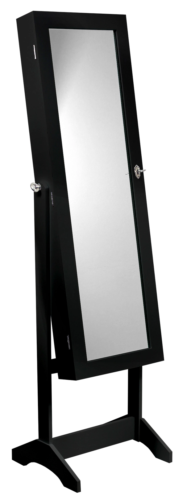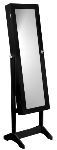 Dette sorte smykkeskab med højt fritstående spejl er en fremragende løsning til både soveværelset og garderoben. Det tilbyder rigelig plads til øreringe, halskæder, ringe og ure, mens fuldspejlet gør det nemt at vælge outfit og lægge makeup. Det minimalistiske udtryk passer let ind i en moderne indretning.