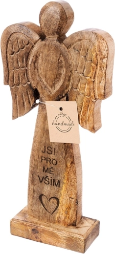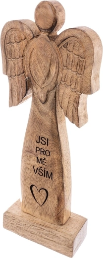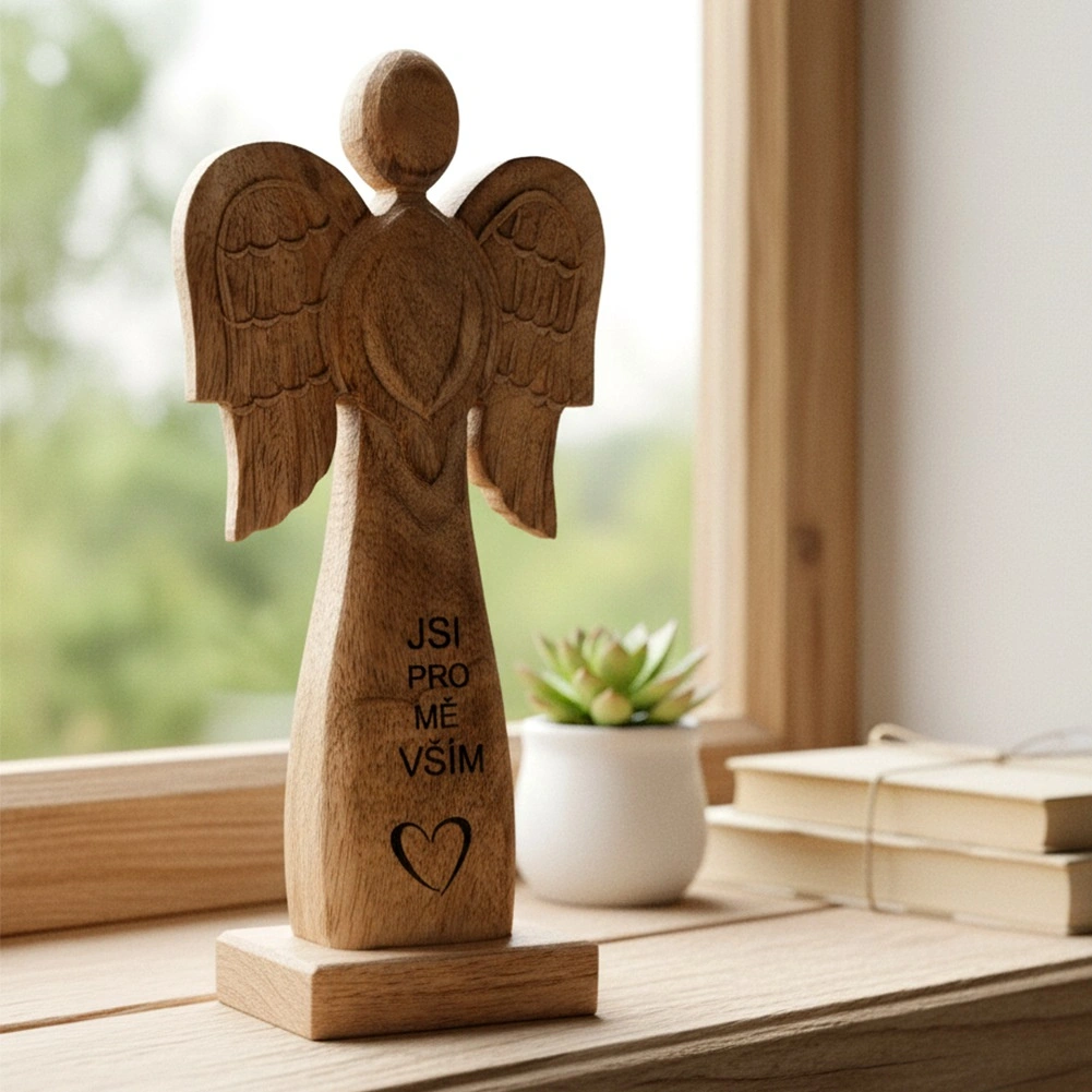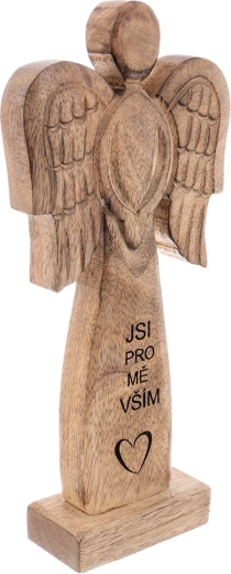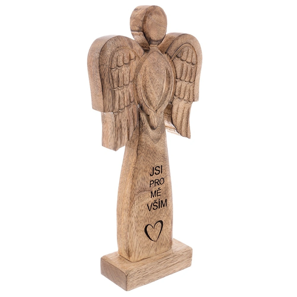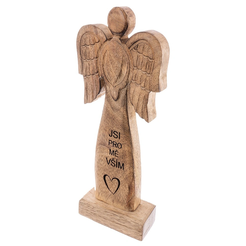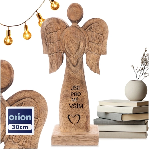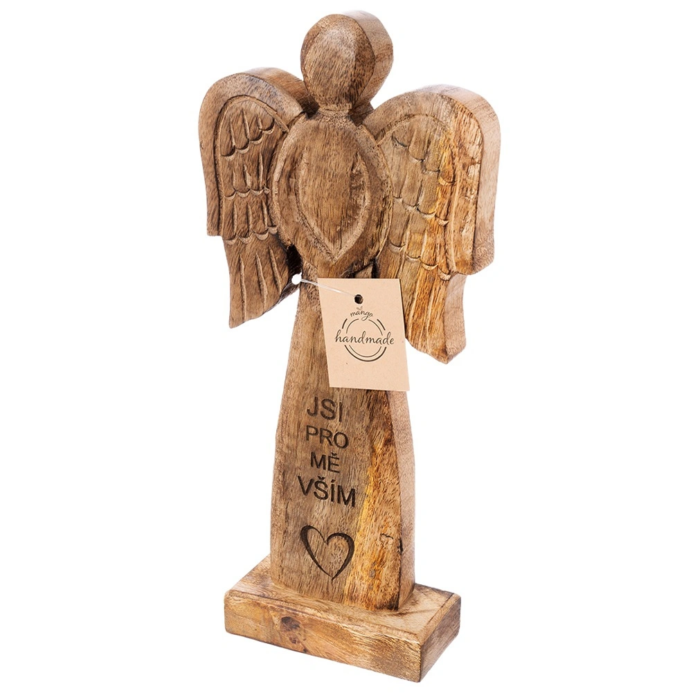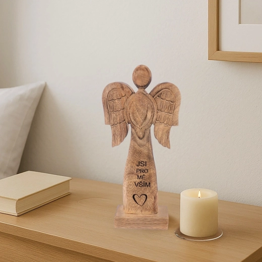 Elegant træfigur af en engel lavet af naturligt mangotræ med stilfulde metalvinger i sort. Et perfekt supplement til indretningen, som tilfører en naturlig og hyggelig atmosfære. Mål ca. 13,5 × 4,5 × 30 cm. Ideel dekoration til stue, soveværelse og kontor samt en velegnet gave til forskellige lejligheder.
