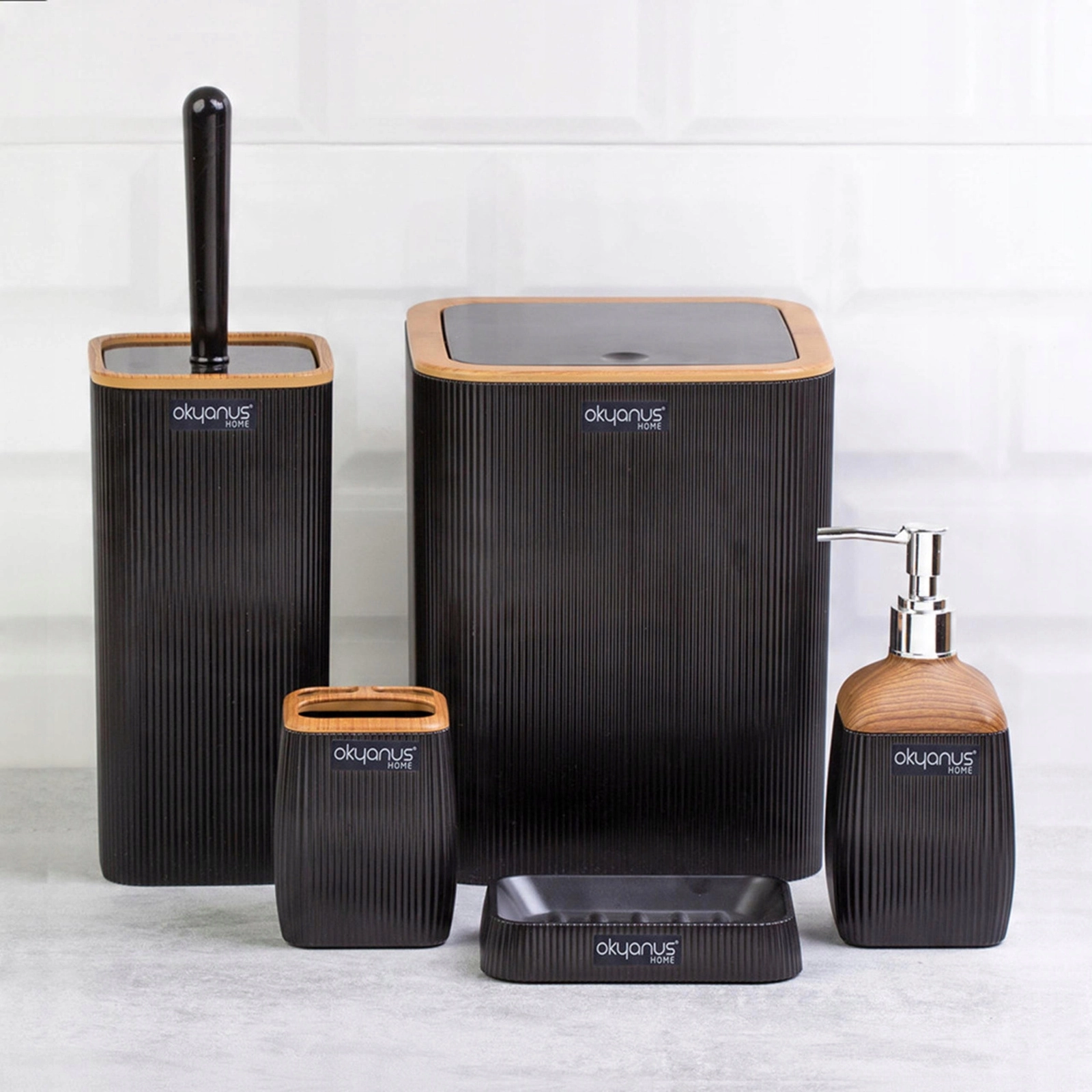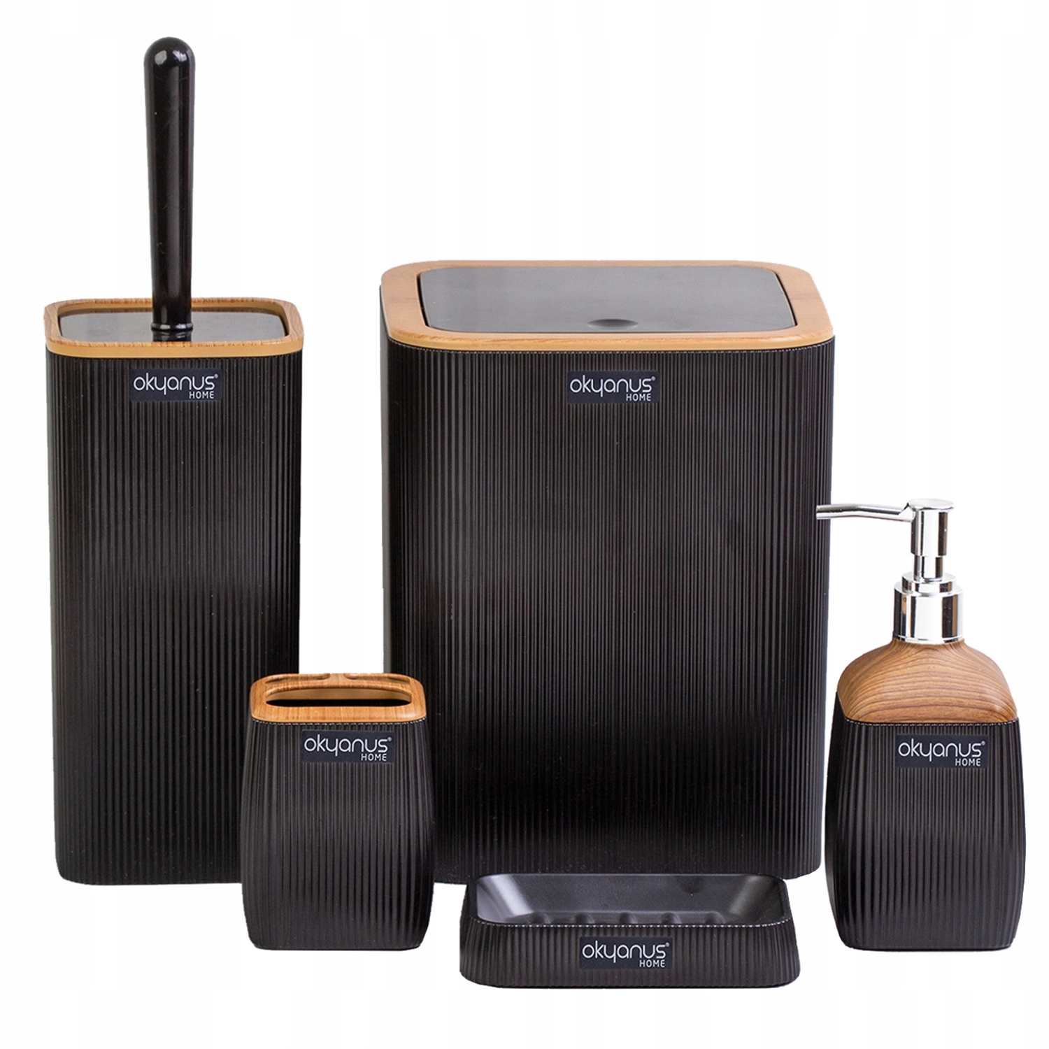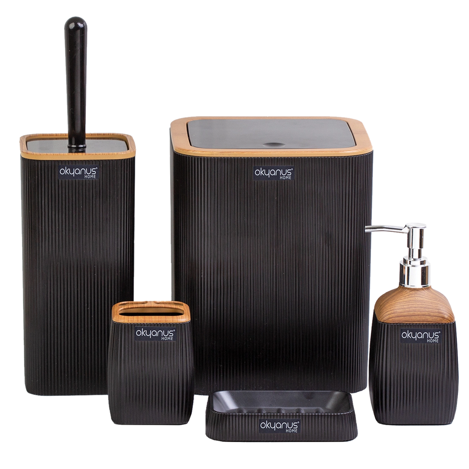 Stilfuldt firkantet badeværelsessæt i elegant sort med trædekor, der giver dit badeværelse et moderne udtryk og praktisk organisering. Skraldespand, toiletsbørste, sæbedispenser, tandkrus og sæbeskål er lavet af holdbar plast, som er let at rengøre og yderst modstandsdygtig over for fugt.
