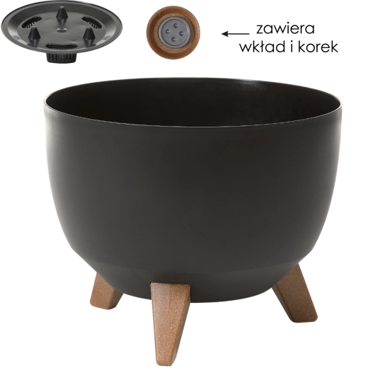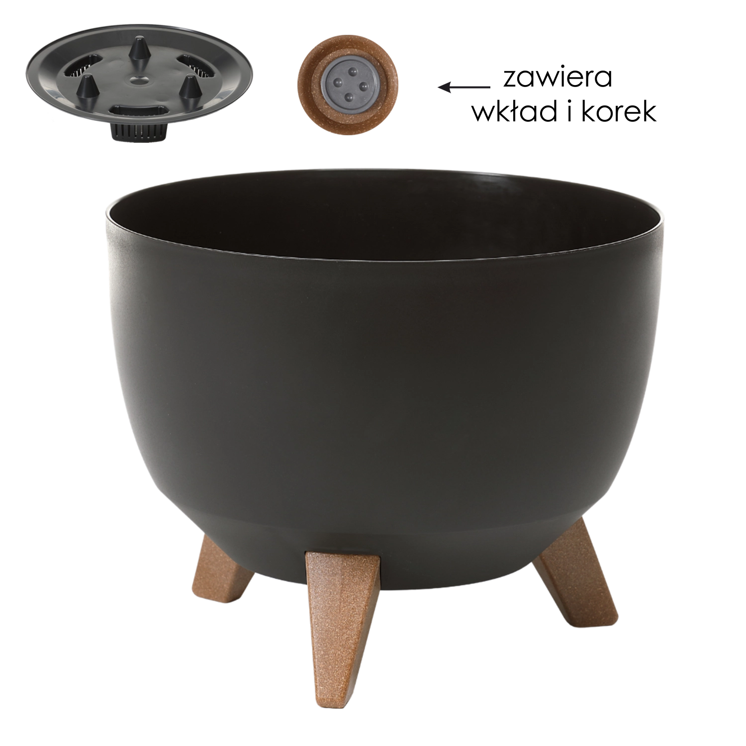 Den stilfulde blomsterskål ROMA med en diameter på 33 cm i elegant sort giver indretningen et moderne præg. Den har en mat overflade, original form og stabile ben i trælook. Den er fremstillet af slidstærk plast med UV-beskyttelse, tåler fugt og sol og giver med et volumen på 12,4 l rigelig plads til planternes vækst. Værktøjsfri montering sikrer øjeblikkelig brug i hjemmet og på altanen.