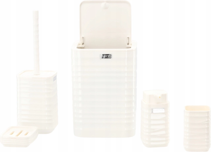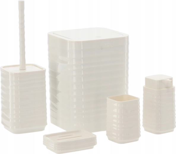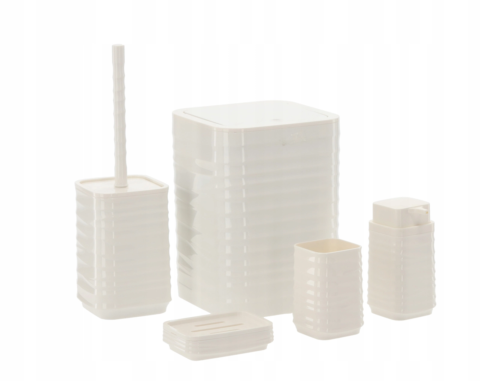 Dette femdelte badeværelsessæt i universel hvid farve tilbyder en funktionel og stilfuld løsning til enhver husstand. Den riflede overflade og de kvadratiske linjer virker rene og moderne, mens det holdbare plast sikrer nem rengøring og lang levetid.