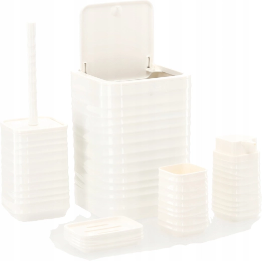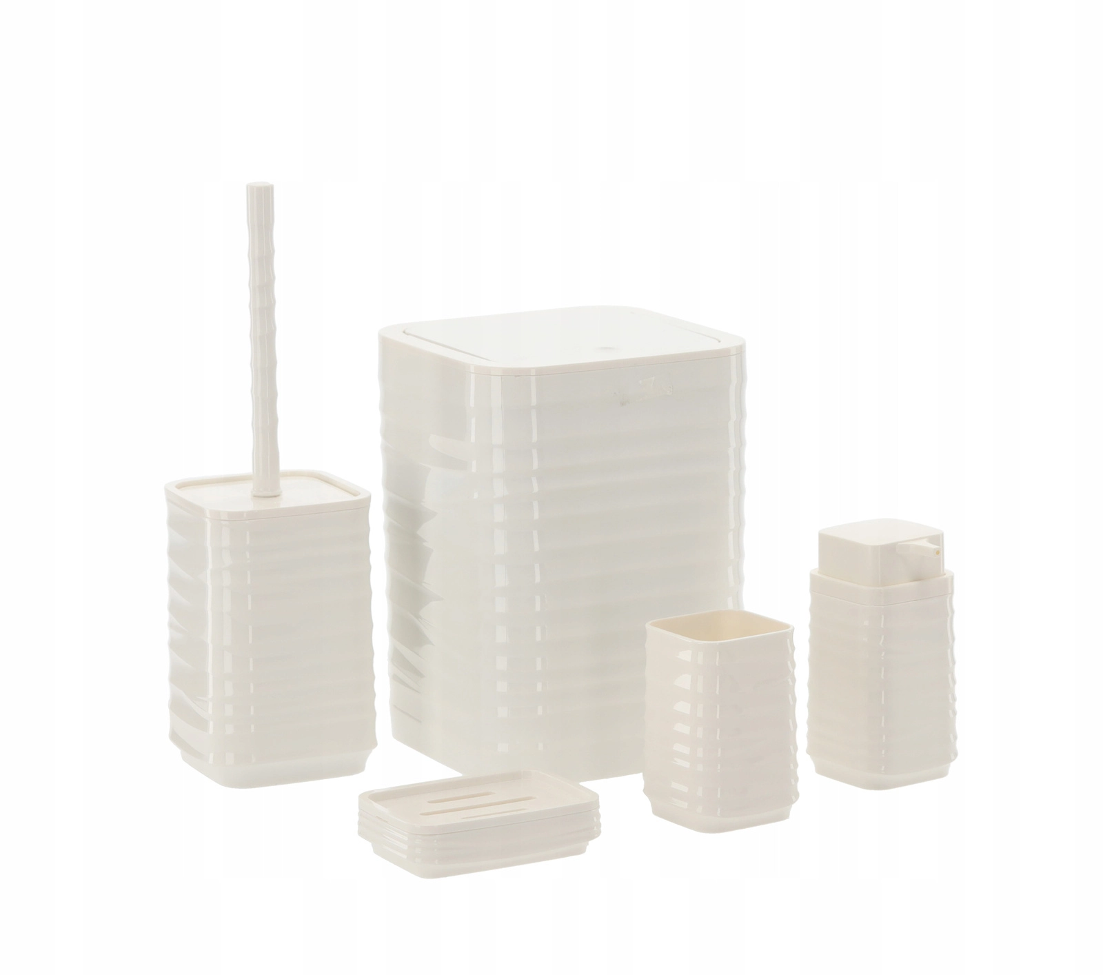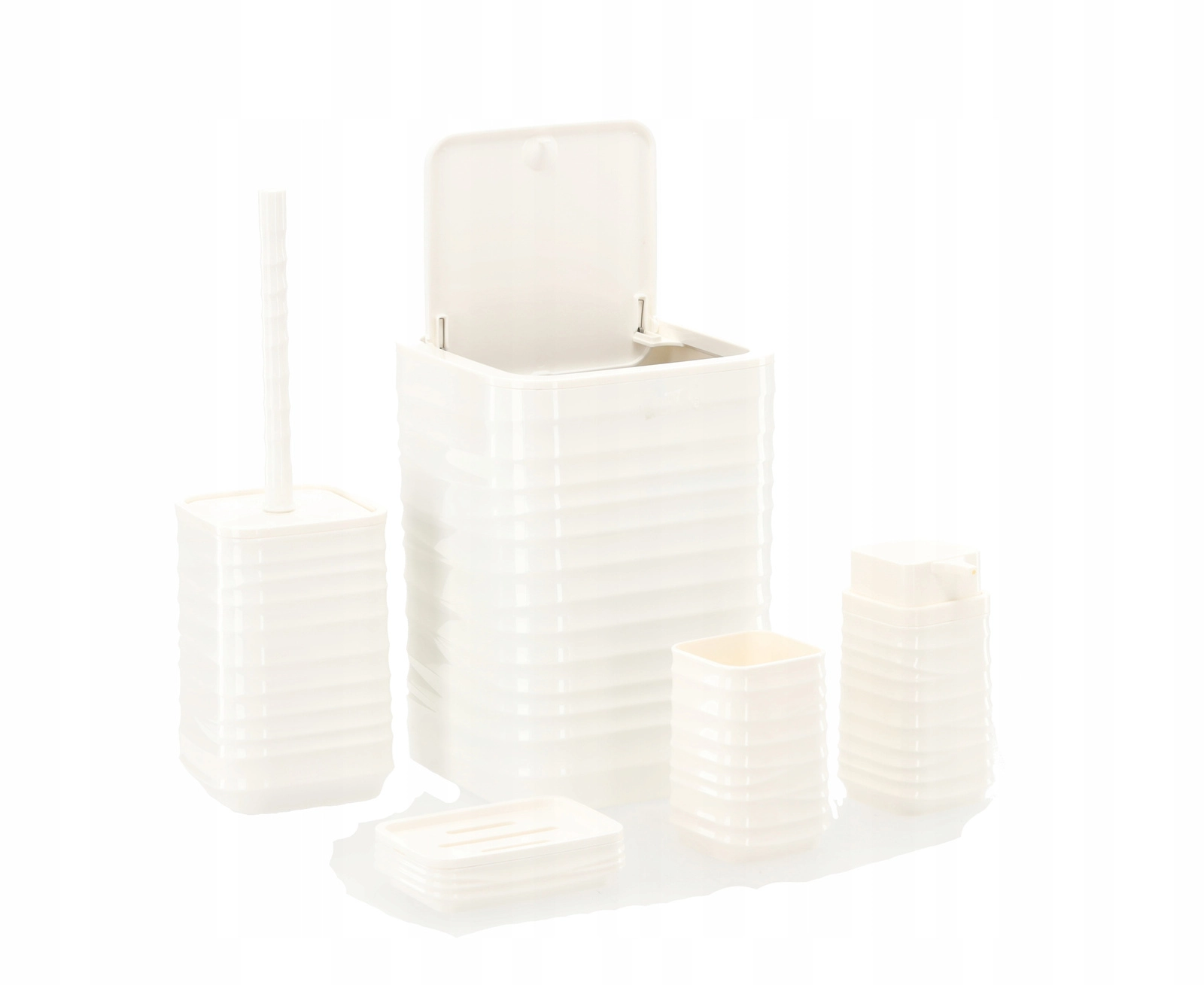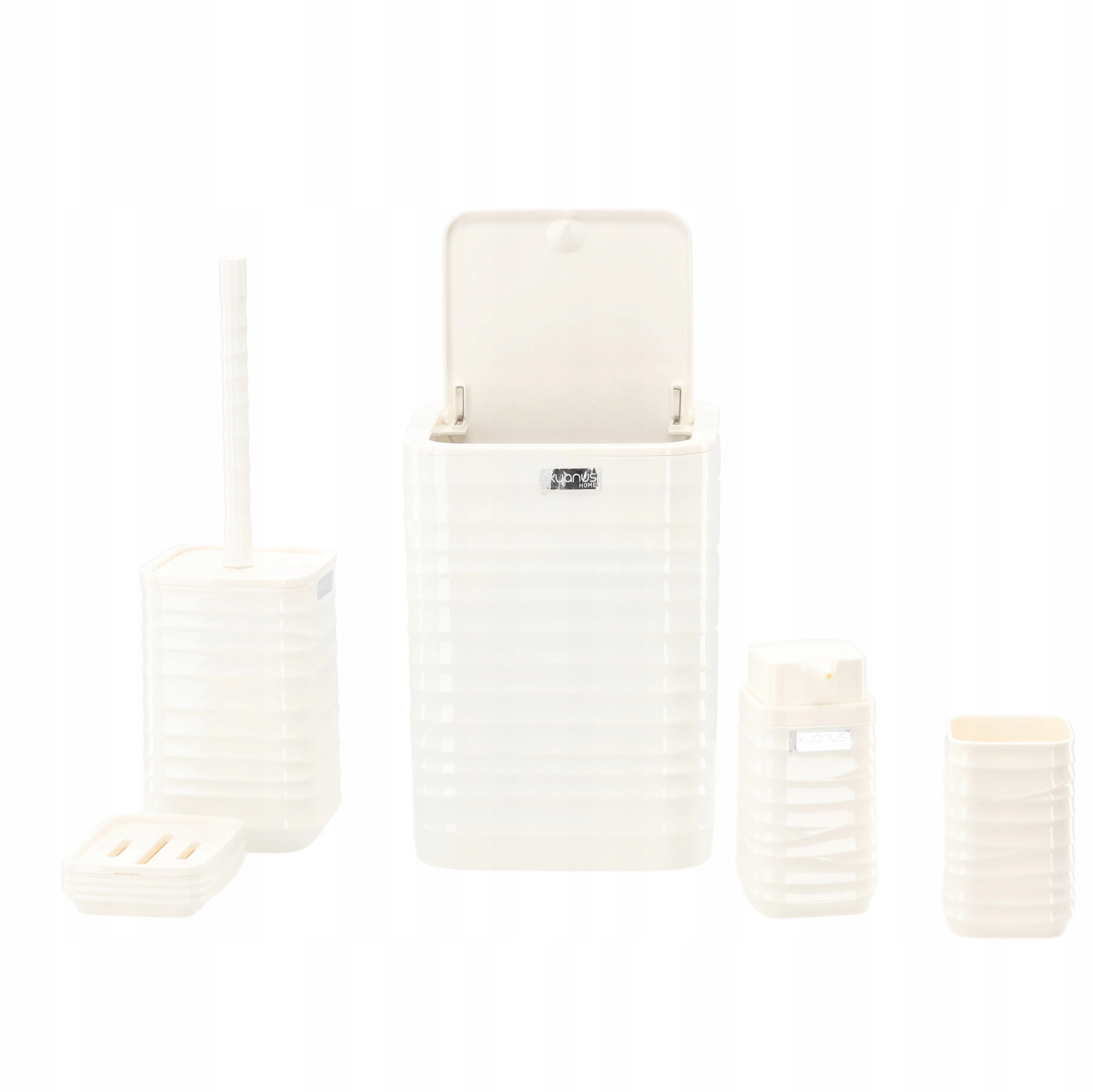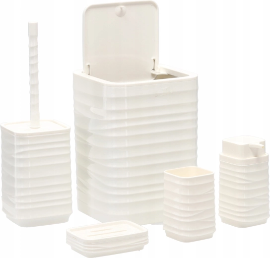 Elegant badeværelsessæt med 5 dele i hvid farve, der samler udseendet af dit badeværelse og gør den daglige hygiejne nemmere. Takket være den moderne riflede kvadratiske design og let aftørrelige plast får du praktisk udstyr: affaldsspand, toiletbørste, sæbedispenser, tandbørstekrus og sæbeskål.
