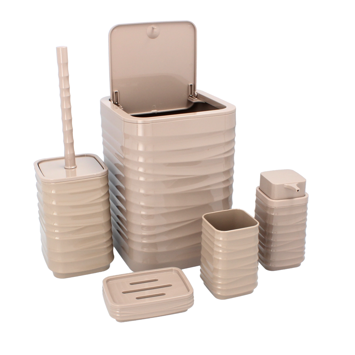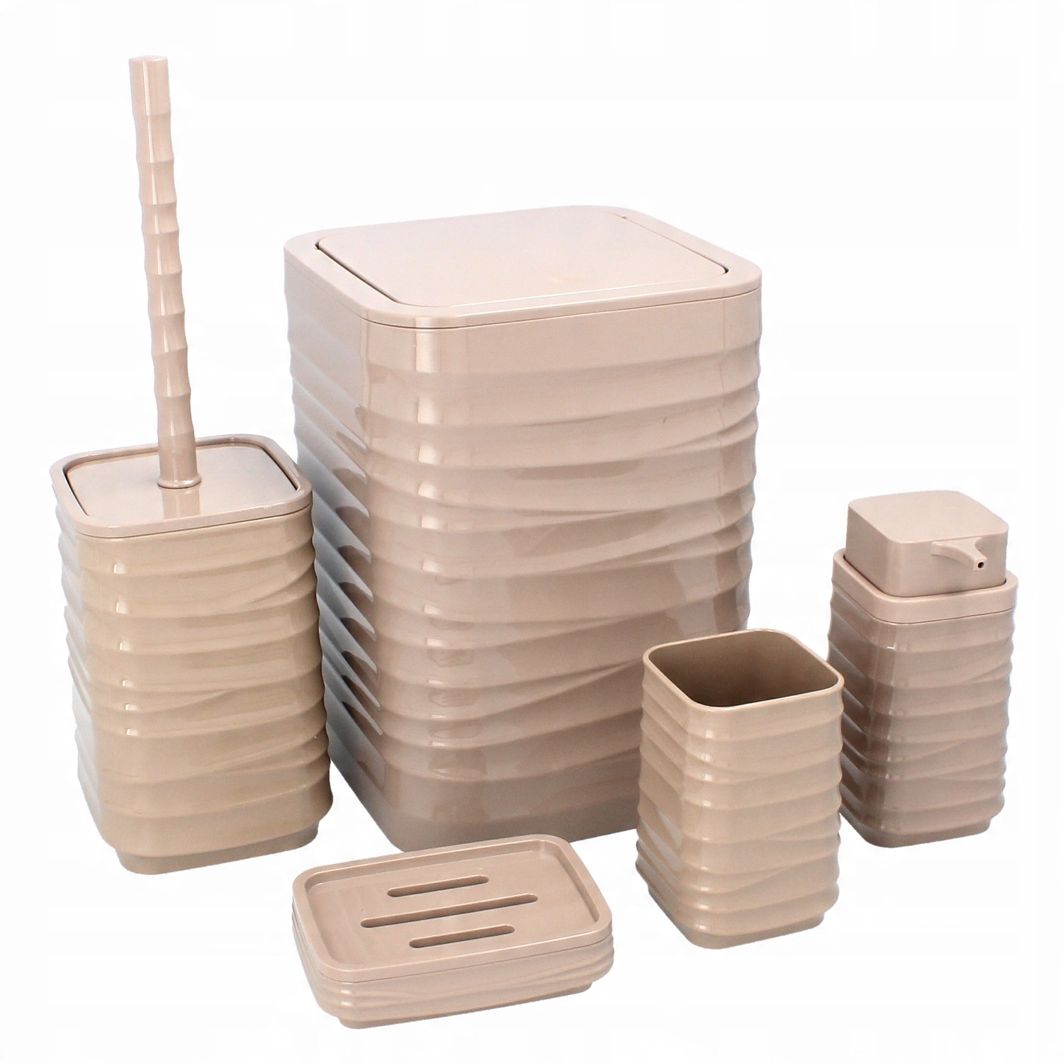 Et stilfuldt badeværelsessæt i slidstærk plast i elegant brun farve, der giver et ensartet udtryk i hele badeværelset. Indeholder en affaldsspand, toiletbørste med holder, sæbedispenser, tandbørsteglas og en sæbeskål. Det praktiske firkantede design med rillet struktur sparer plads og er let at vedligeholde.