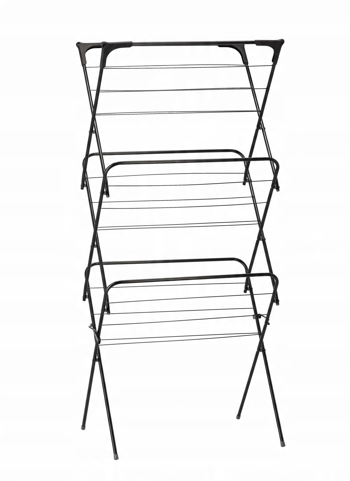 Den solide metalramme i sort tåler daglig brug og vejrpåvirkninger og sikrer stabilitet ved tørring både hjemme og på altanen.