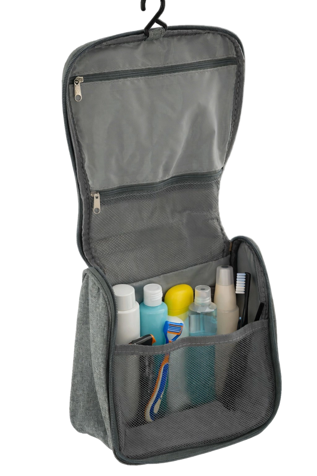 Den indvendige indretning med flere lommer og elastiske stropper holder flasker, kosmetik og småting stabilt på plads. Det kompakte design på 22 × 20 × 12 cm sparer plads i bagagen og giver samtidig rigelig plads til hverdagens nødvendigheder. Et fremragende valg til rejser, camping, forretningsrejser og besøg i fitnesscentre.