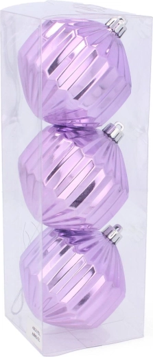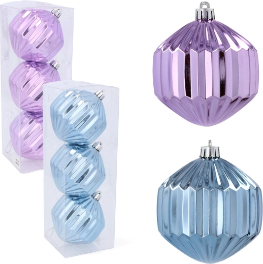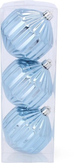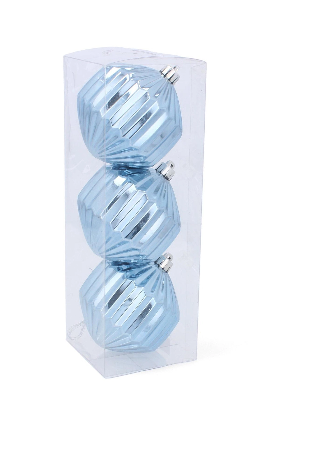 Sættet med tre pyntkugler i en gennemsigtig æske er klar til øjeblikkelig ophængning og sikker opbevaring efter sæsonen.