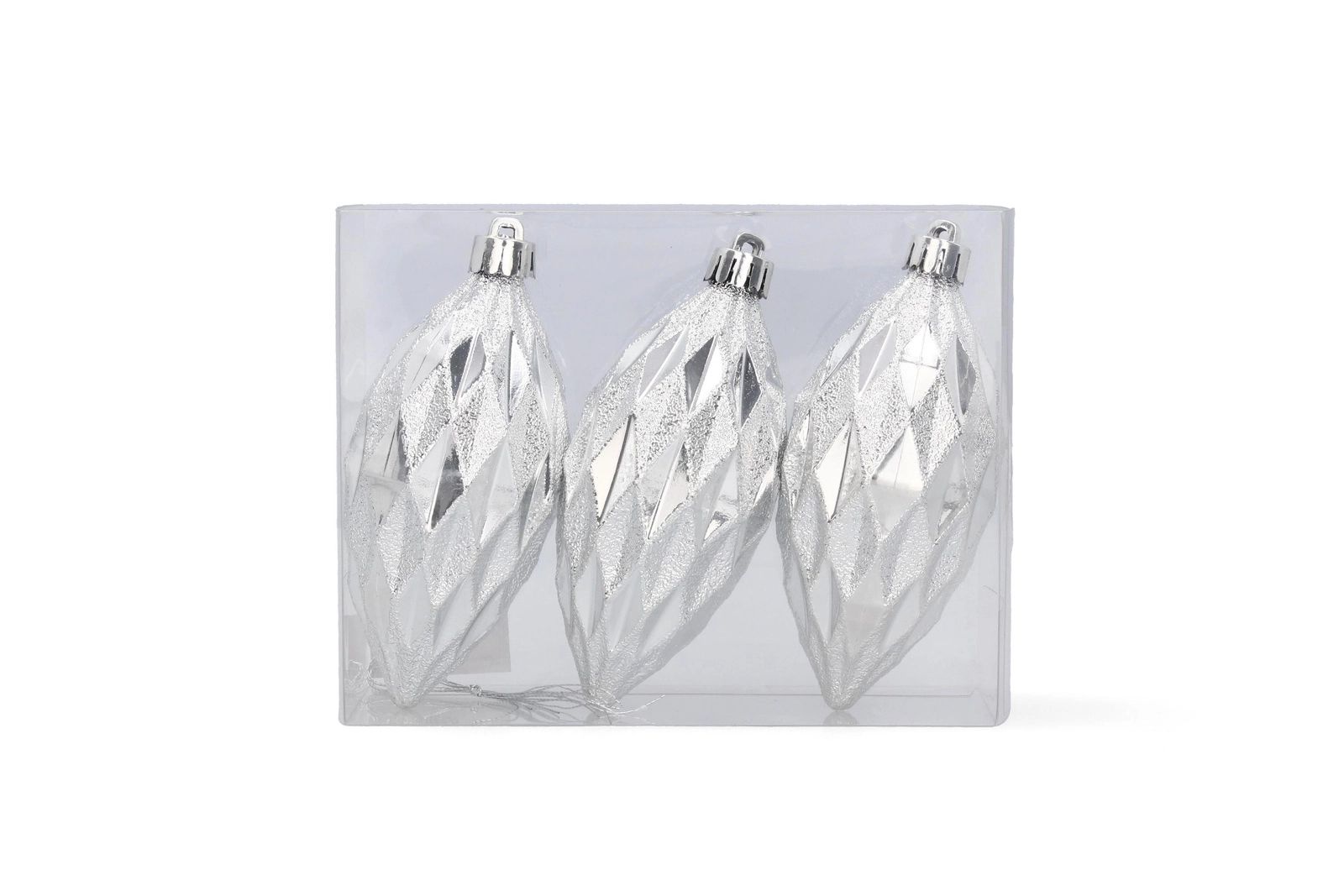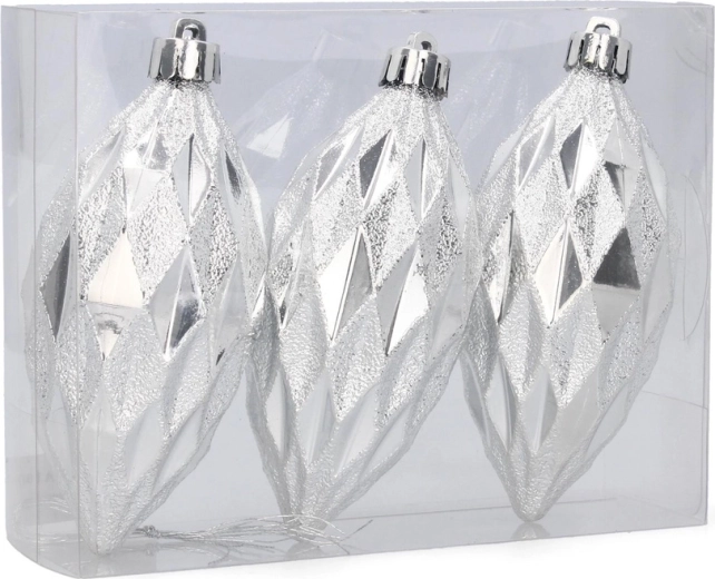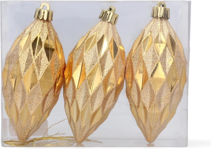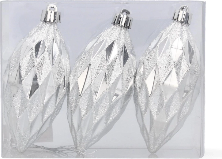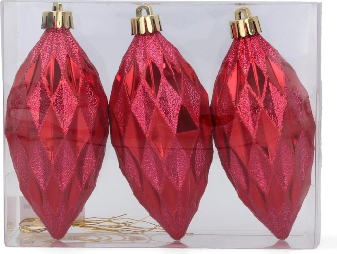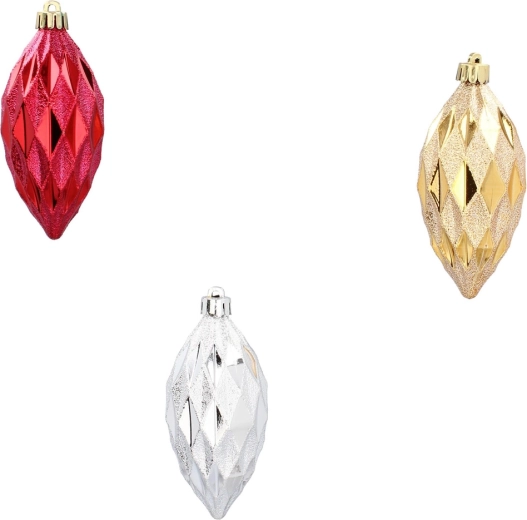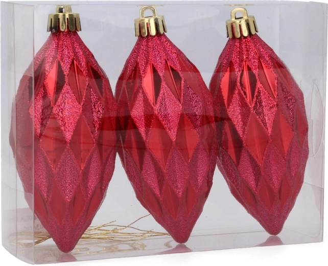 Skab en stemning af traditionelle juleaftener derhjemme med et sæt på tre aflange ornamenter i de populære farver – rød, guld og sølv. Den blanke overflade giver udsmykningen en unik glans og fremhæver lysrefleksionerne på dit juletræ.