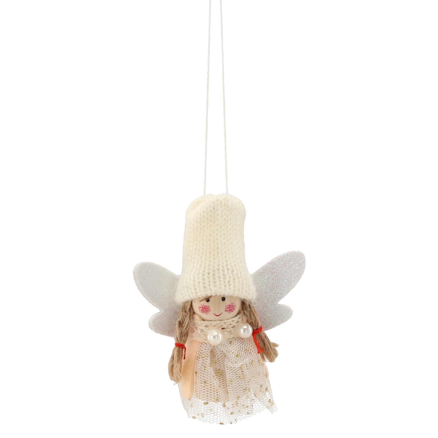 Let tekstilpynt med glitrende vinger, tylkjole med gyldne prikker og løkke for nem ophængning giver træet et varmt, festligt præg.