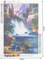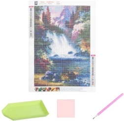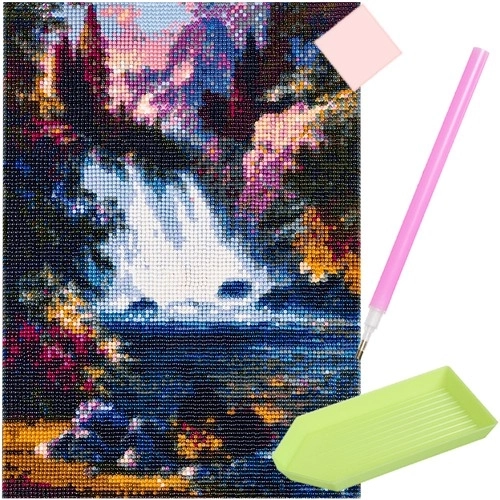 Motivet vandfald i størrelsen 30 × 40 cm (billedflade 25 × 35 cm) træder frem med en glitrende effekt og egner sig efter færdiggørelse perfekt til indramning eller ophængning uden ramme. Sættet er komplet – du har alt lige ved hånden.