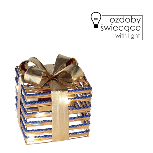 Elegant juledekoration formet som en gave på 15 cm med varmt hvid LED-belysning og stor blå sløjfe, som vil oplyse dit hjem. Den lette konstruktion af tråd omviklet med gylden snor skaber en romantisk atmosfære, og takket være batteridrift 3× AA kan du nemt placere den hvor som helst – på vindueskarmen, under juletræet, ved pejsen eller som udendørs pynt ved indgangen.