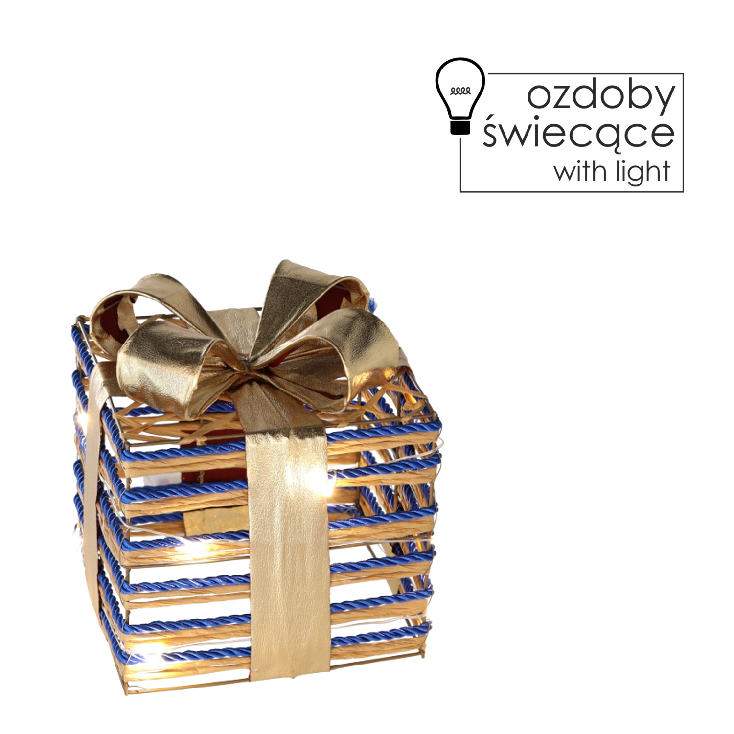 Denne lysende julegave er et stilfuldt tilbehør, der øjeblikkeligt skaber højtidelig stemning. Kombinationen af gylden glans og den dybblå sløjfe virker både luksuriøs og delikat. Varme hvide LED-dioder er energibesparende og lader snorens struktur skinne smukt igennem, hvilket giver en hyggelig vinteratmosfære.