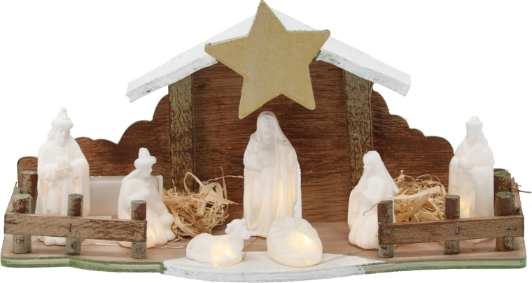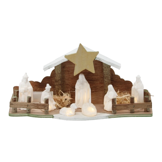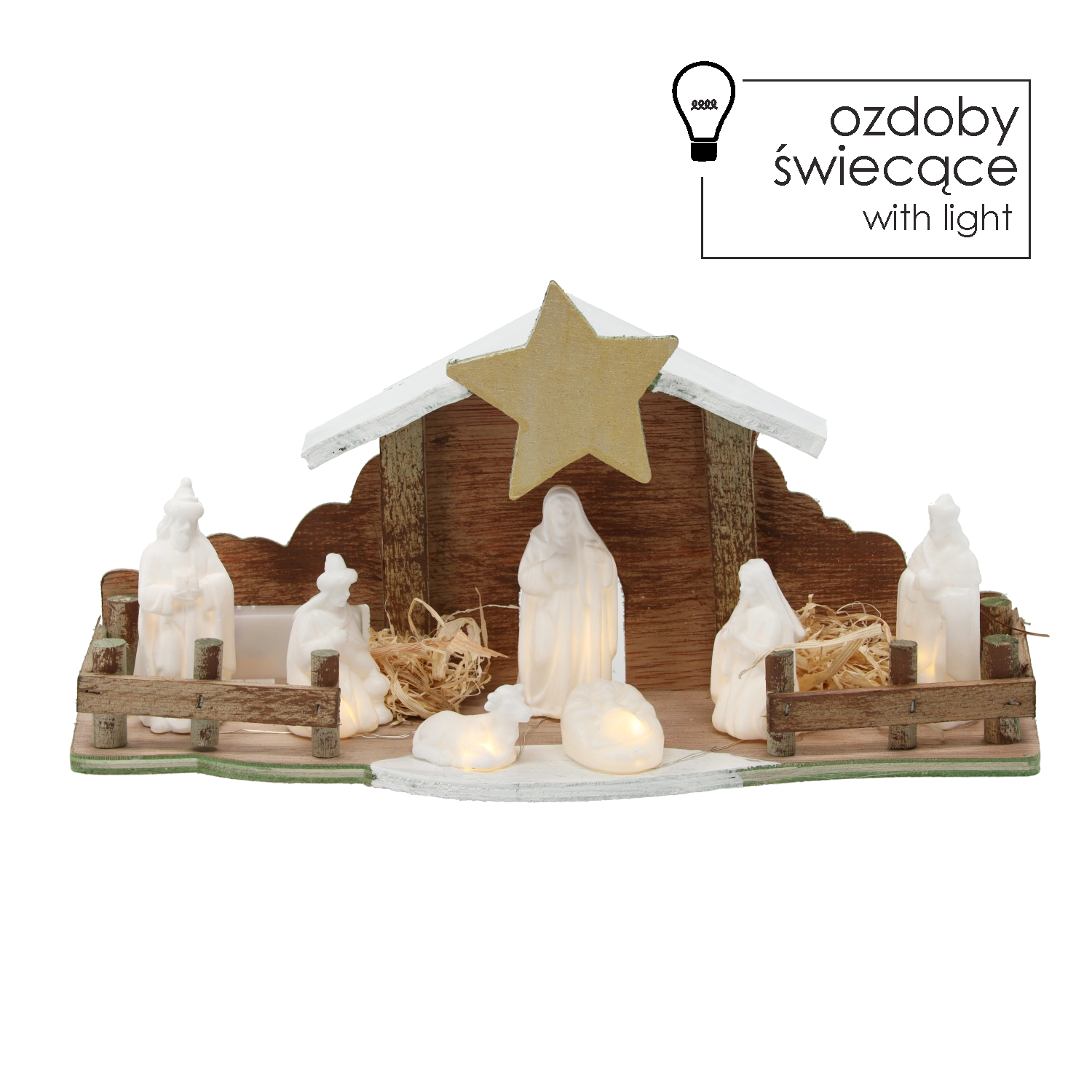 Denne stilfulde bordjulekrybbe med træstald og stjerne suppleres af hvide figurer af Den hellige familie, hyrder og dyr. Integrerede varme LED oplyser scenen diskret og giver interiøret et behageligt lys uden at blænde. Takket være de rustikke elementer af træ og strå passer den til klassisk, boho og landlig stil.