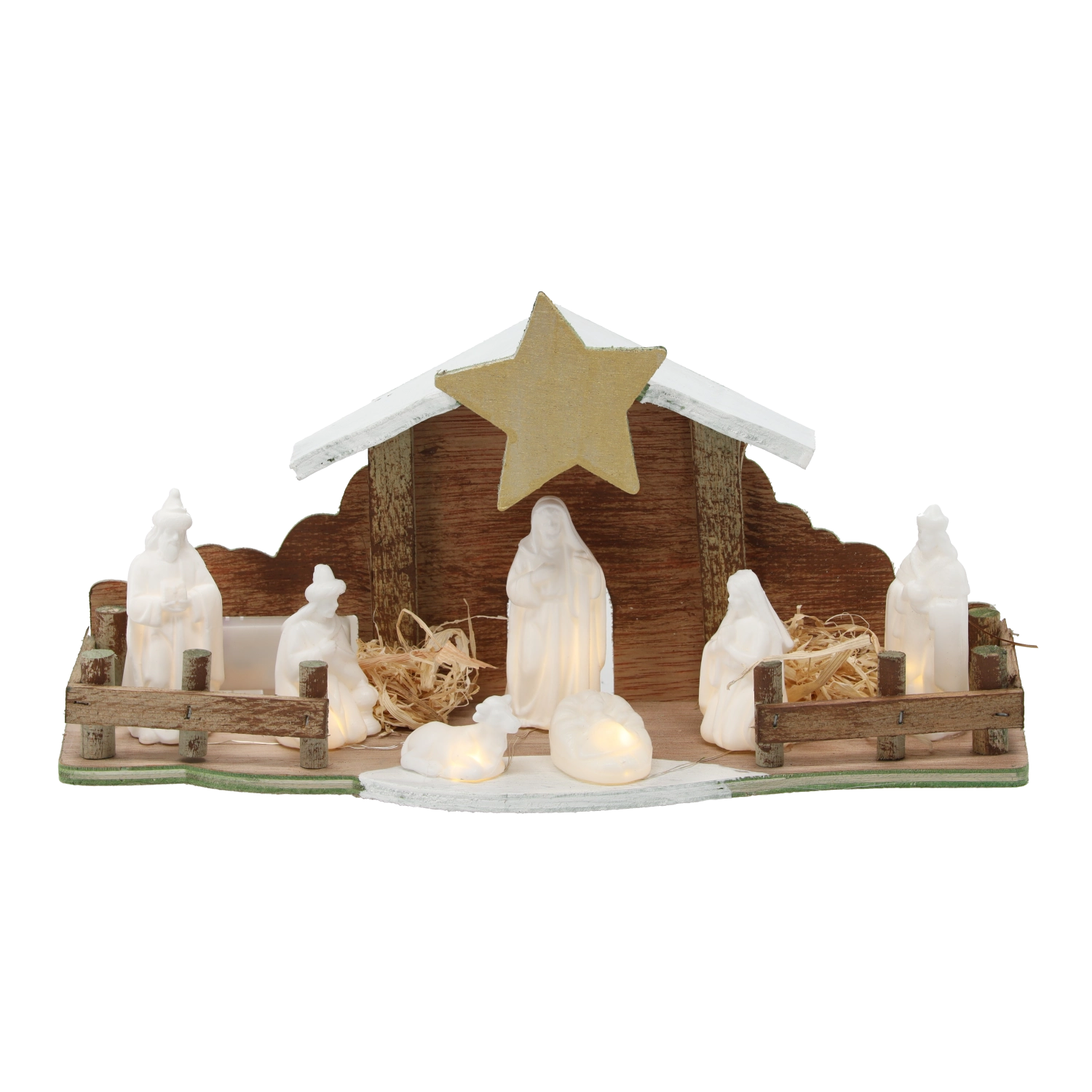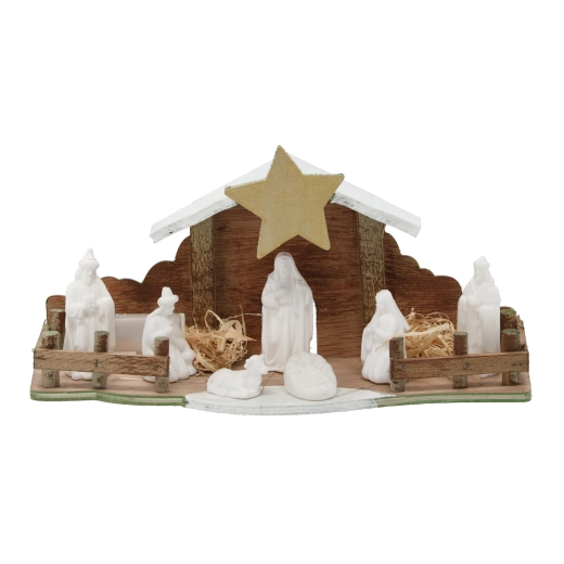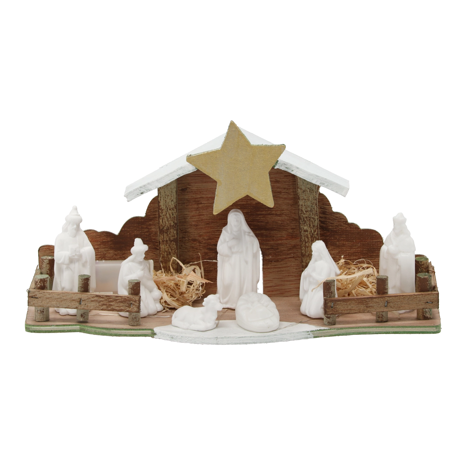 Stald af naturligt træ med hegn, stjerne og strådetaljer virker autentisk og passer perfekt til julepynten.