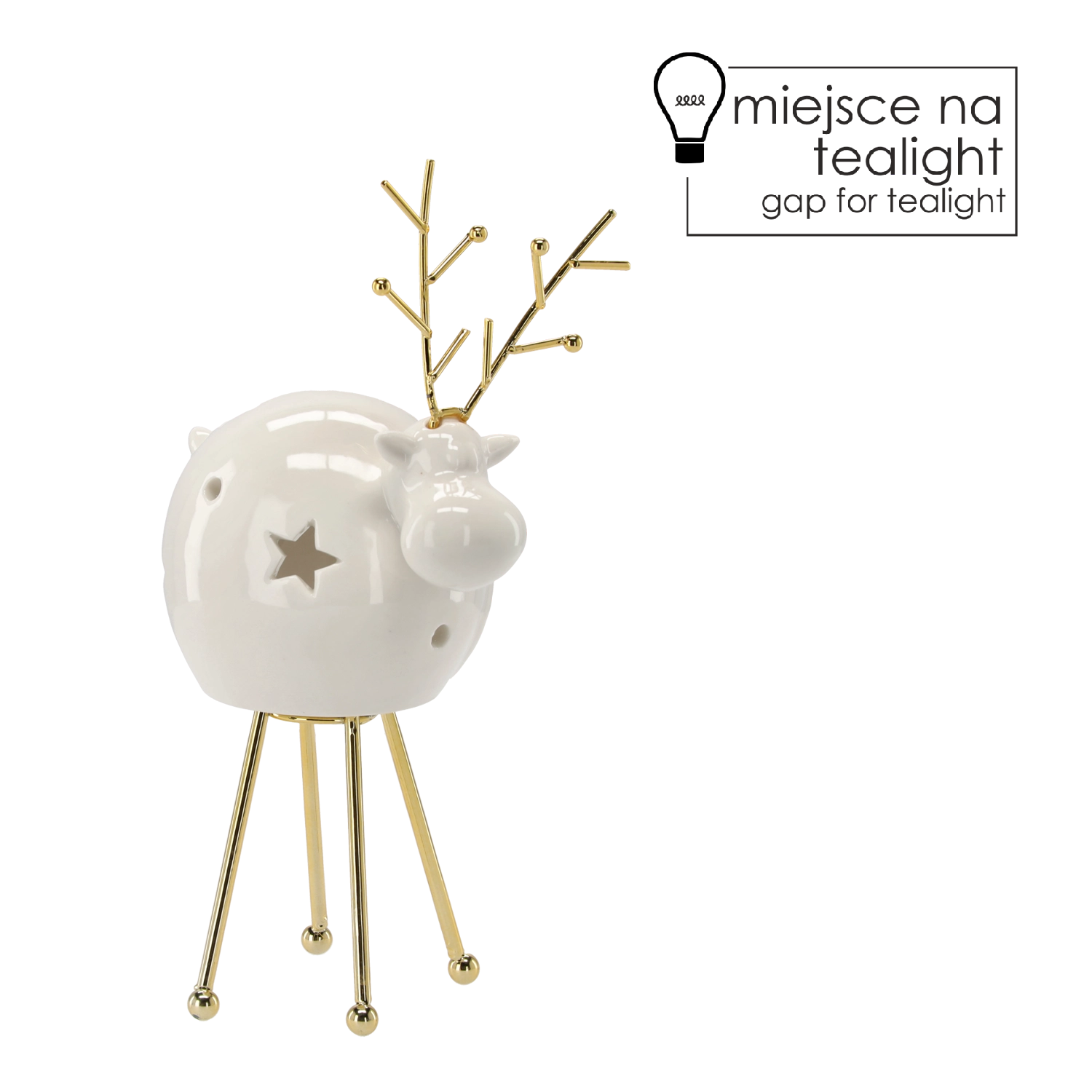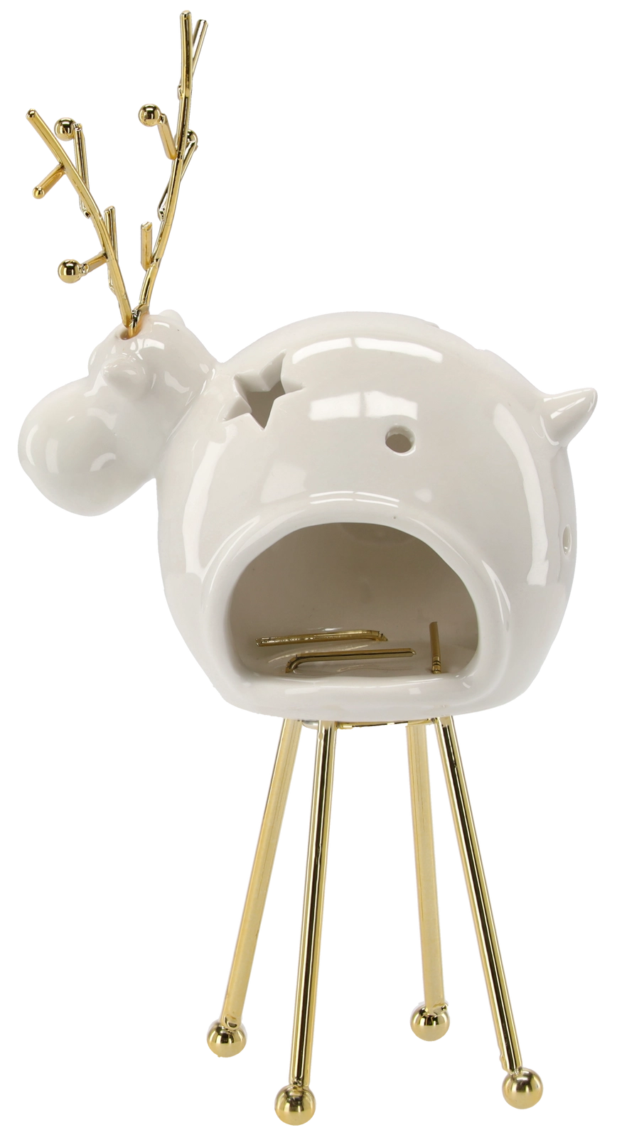 Den stilfulde lysestage i rensdyrform kombinerer et traditionelt julemotive med praktisk anvendelse. Det kvalitetsmæssige metalhåndværk med gylden overflade giver en moderne og samtidig festlig fremtoning, der let fuldender din sæsonstyling.