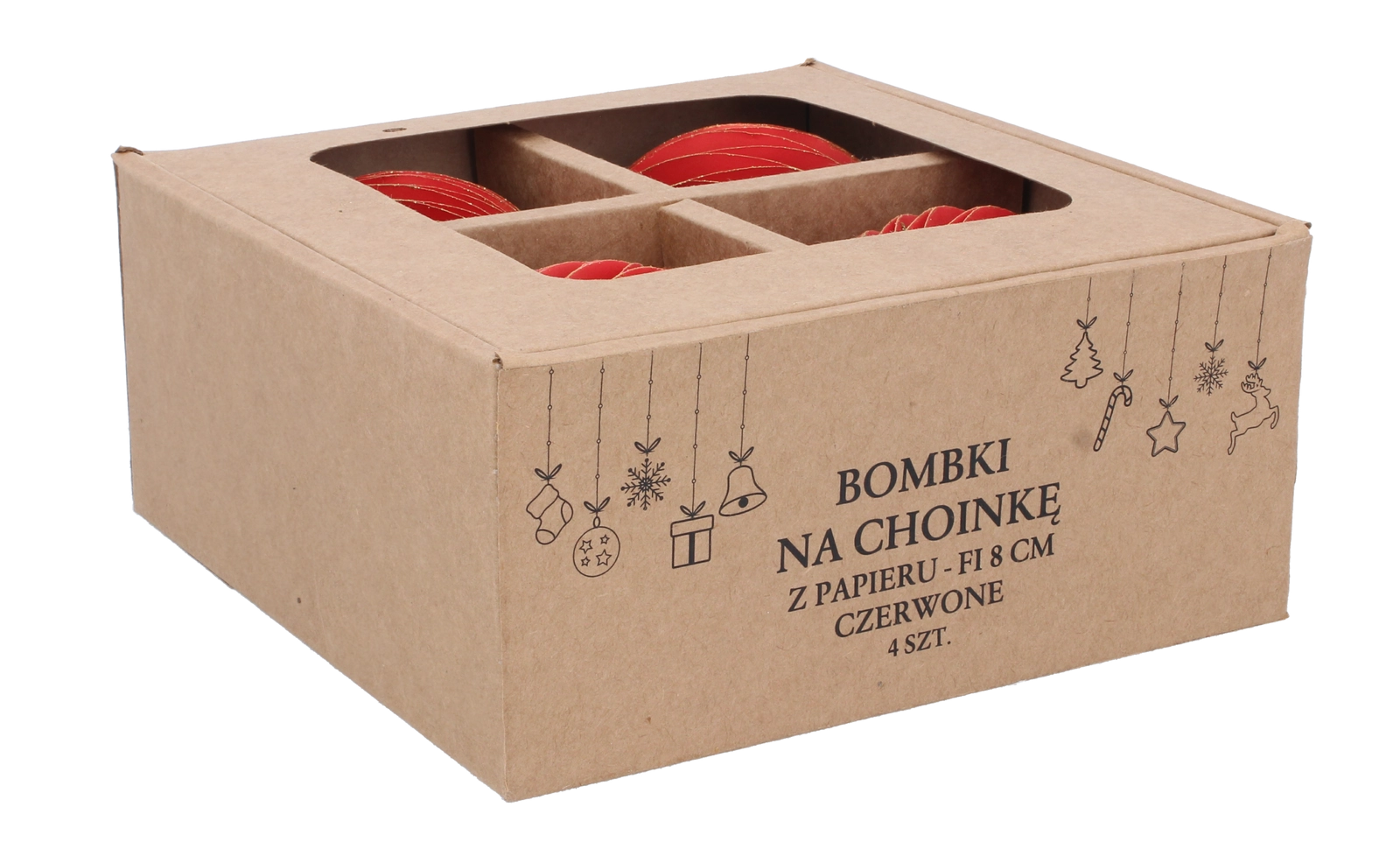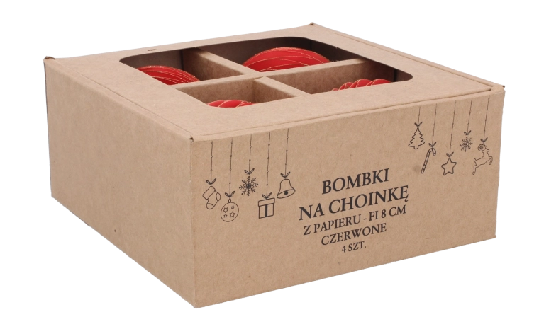 Dette sæt med fire røde ornamenter giver dit hjem en traditionel og elegant julestemning. Takket være det omhyggeligt valgte papirmateriale er ornamenterne lette, sikre og splintfrie, hvilket gør dem ideelle til familierum. Den universelle diameter på 8 cm og den mættede farve er lette at kombinere med andre dekorationer.