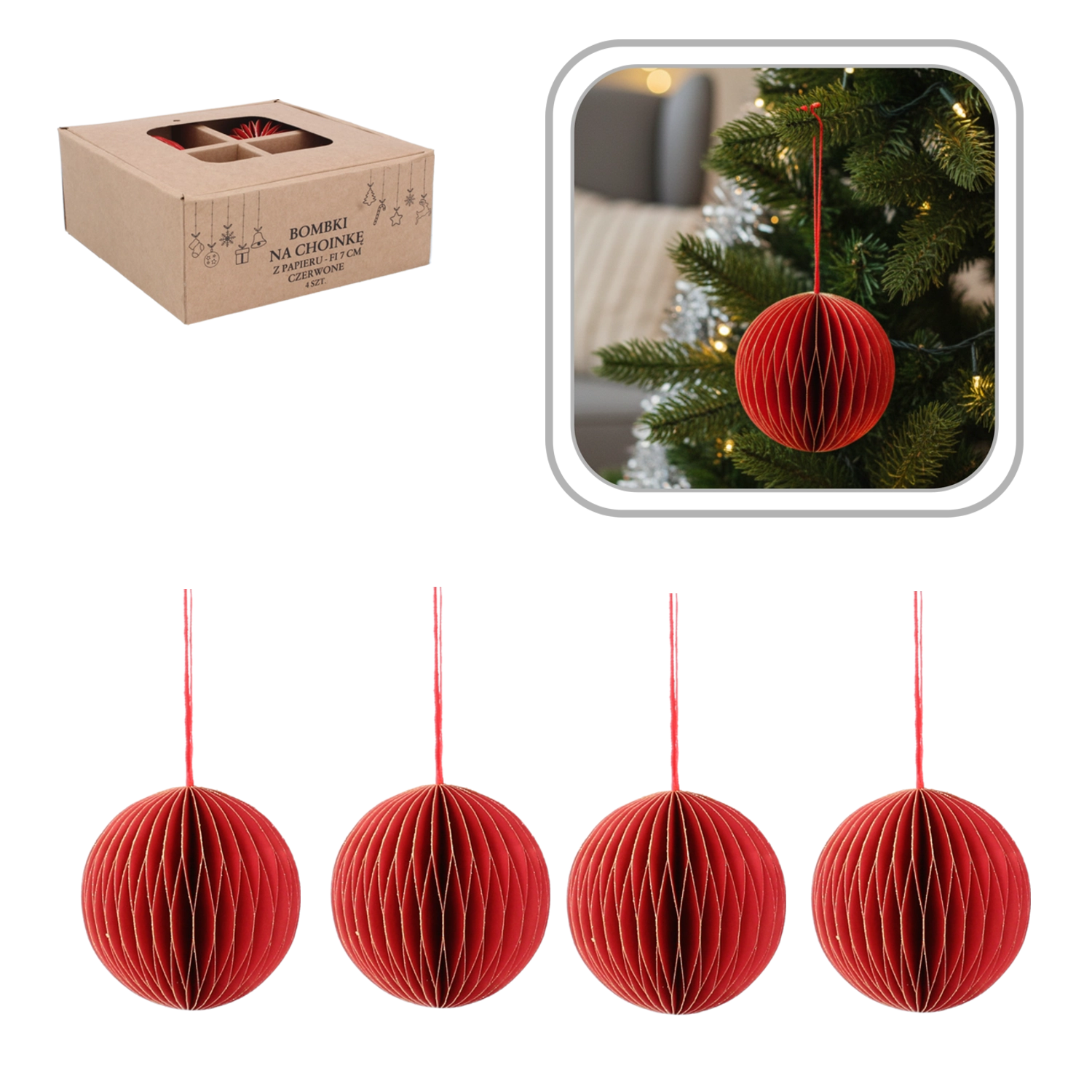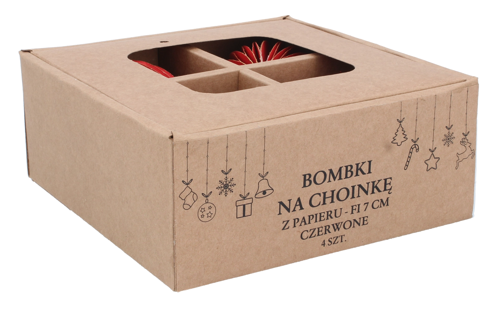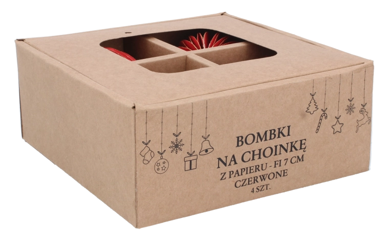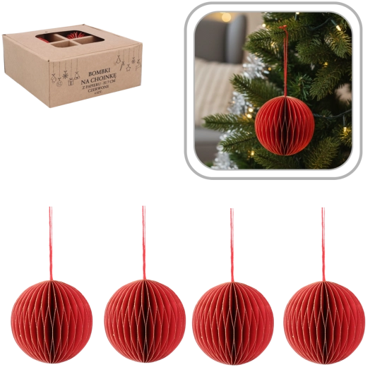 Dette sæt med fire papirjulepynt er ideelt til dig, der ønsker smagfuld og let dekoration til juletræet, kransen eller festlige arrangementer. Kvalitetsforarbejdning og en dyb rød nuance giver interiøret en varm og stilfuld atmosfære.