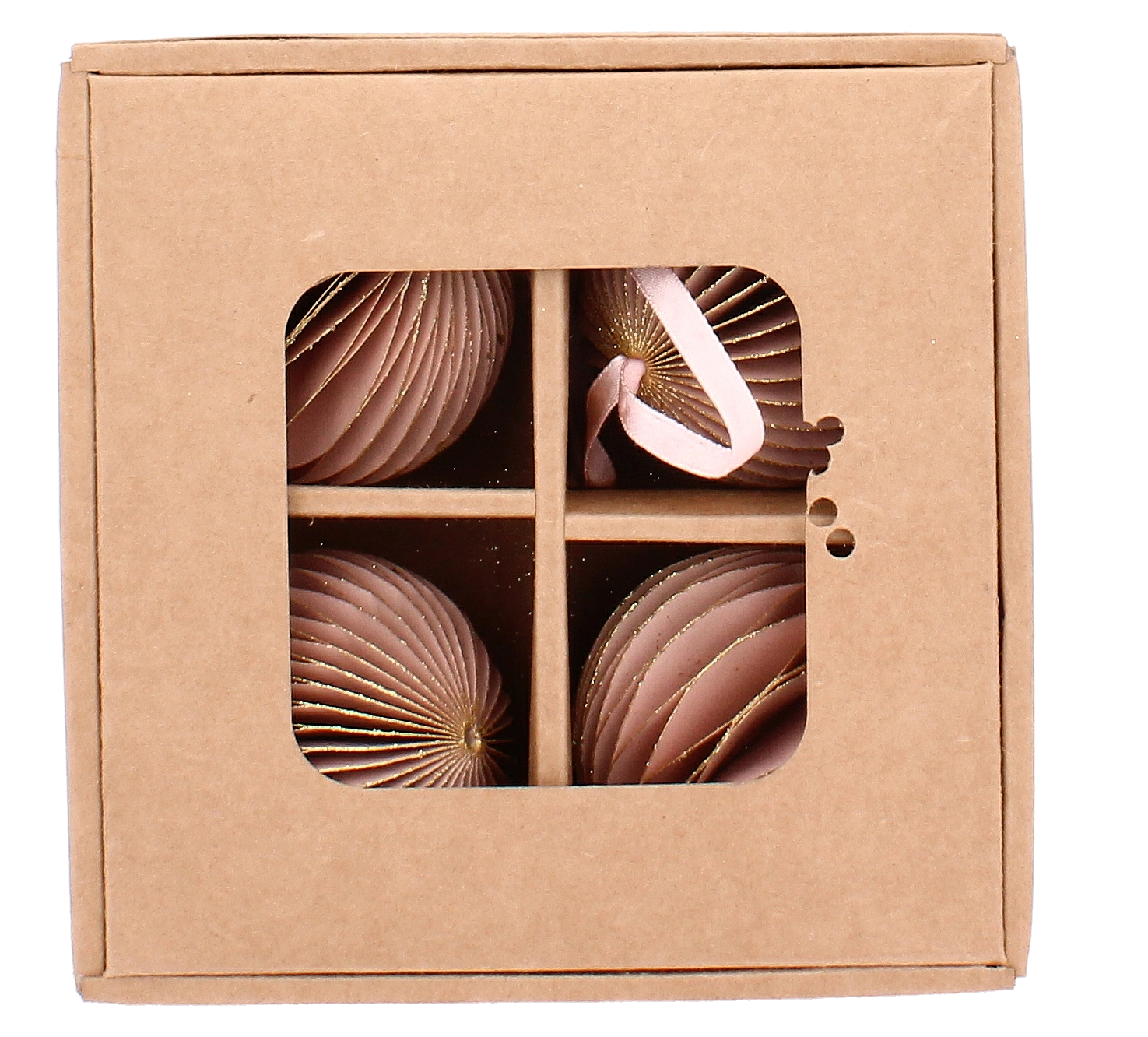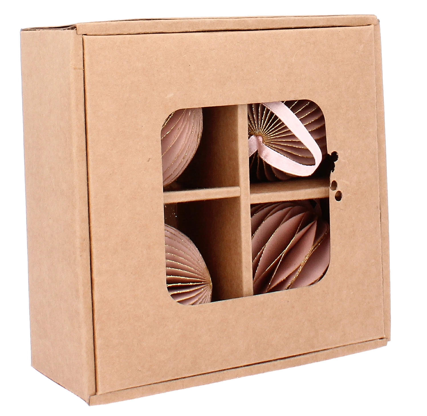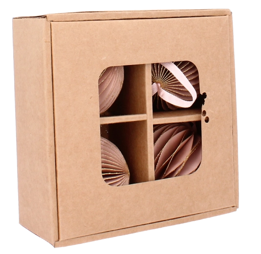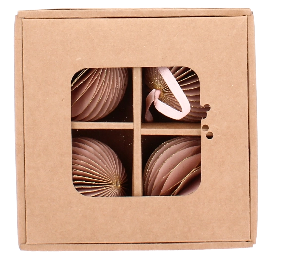Et stilfuldt sæt med fire lyserøde papirjuleornamenter med en diameter på 7 cm giver dit træ og dine dekorationer et blidt og elegant præg. Hver ornament er let, sikker for børn og kæledyr, og takket være den medfølgende snor til ophæng er den nem at placere på juletræ, guirlande eller krans. Det sammenklappelige design sikrer nem opbevaring efter højtiden og langvarig brug.