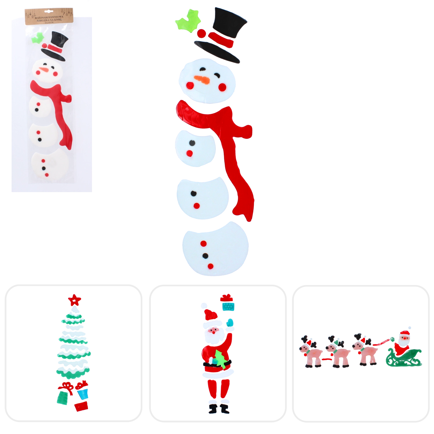 Sættet med fire designs lader dig kombinere motiver efter humør: ikonisk JULEMAND, snemand med halstørklæde og hat, juletræ med stjerne samt slæde med rensdyr. Delene er segmenterede, så du kan placere dem kreativt og skabe originale kompositioner på ruder, butiksvinduer og i børneværelser.