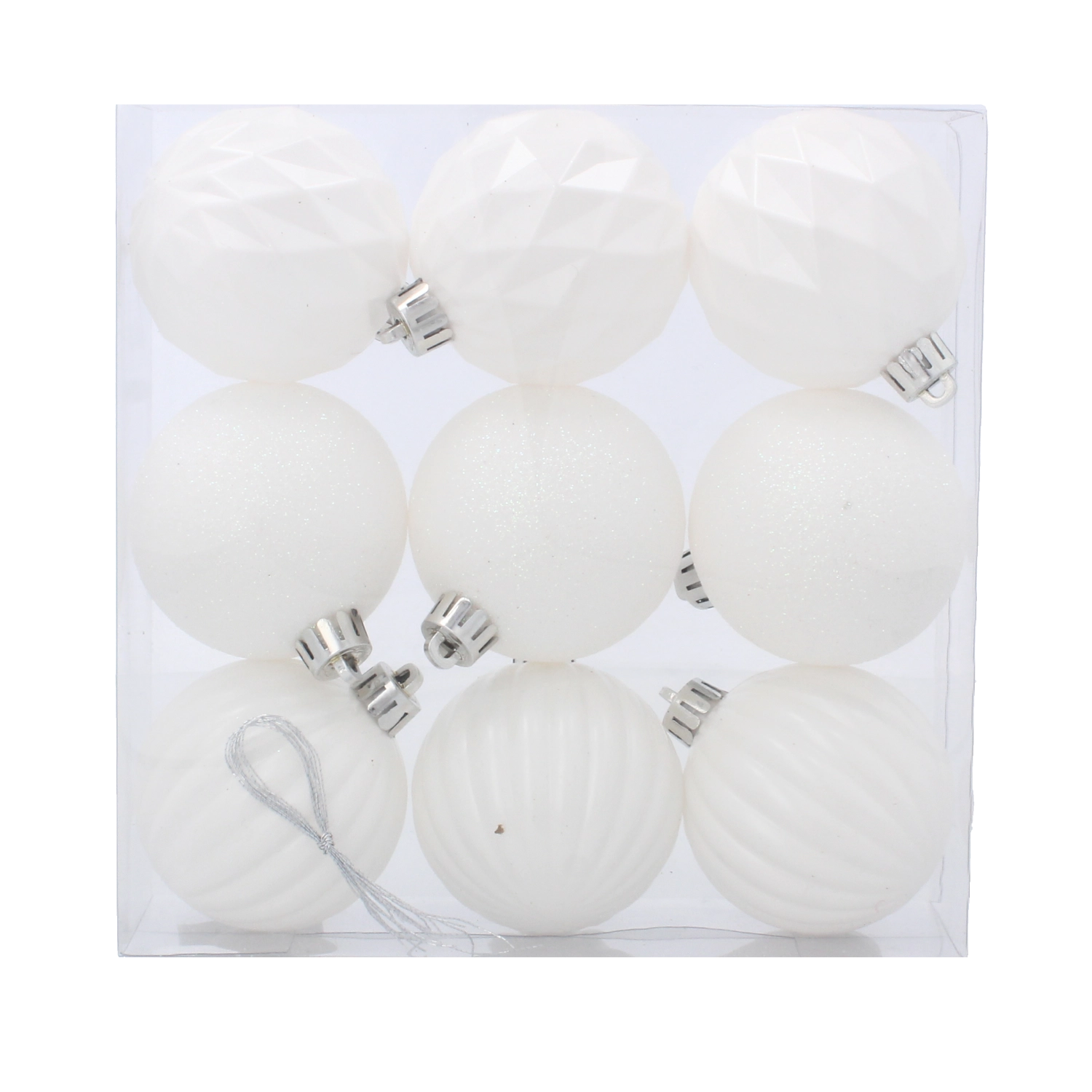 Elegant sæt med ni hvide julekugler med en diameter på 6 cm, der giver dit træ og din indretning et festligt præg. Kombinationen af matte, blanke og glitrende overflader skaber en harmonisk helhed, der let kan matches med andre dekorationer. Let og holdbar plast sikrer sikker og uknuselig anvendelse i hjem med børn og kæledyr.